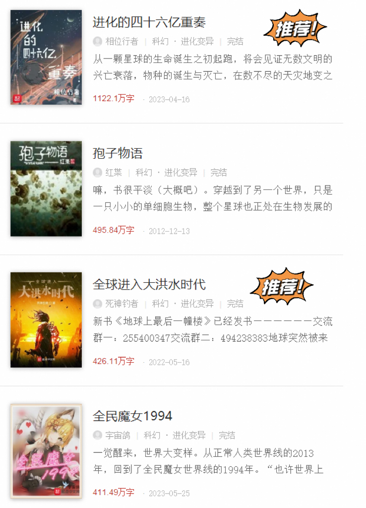 《重生之星空巨蚊》 步跃 《进化的四十六亿重奏》 相位行者 《恐怖都市》 猛虎道长 《孢子物语》 红枼 《九星毒奶》 育 《全球进入大洪水时代》 死神钓者 《最后人类》 黑瞳王 《全民魔女1994》 宇宙鸽 《九星之主》 育 《作为神降临》 火烧好好吃 《绝地虫生》 花瓣澡 《终极宿主》 一江秋月