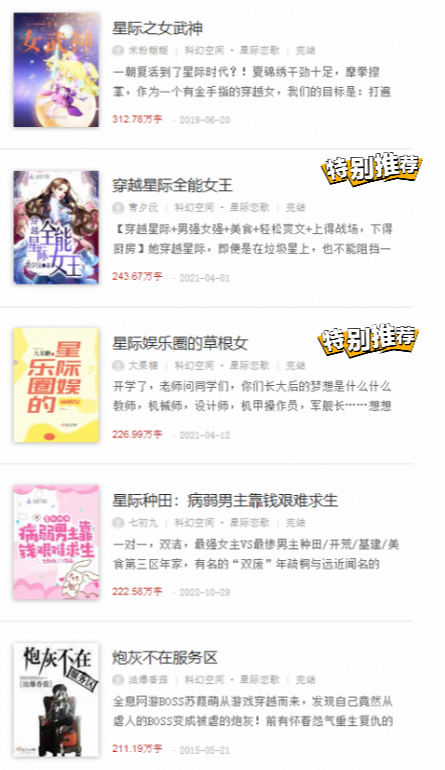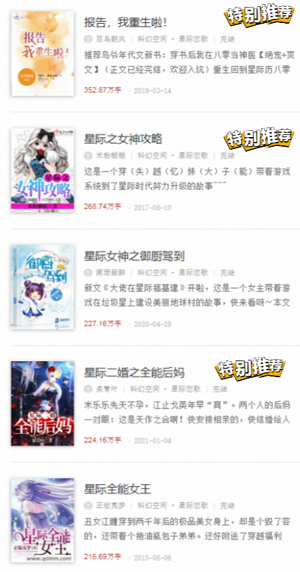 《报告,我重生啦!》百鸟朝风 《星际之女武神》米粉糊糊 《星际之女神攻略》米粉糊糊 《穿越星际全能女王》青夕沅 《星际女神之御厨驾到》阑珊留醉 《星际娱乐圈的草根女》大果糖 《星际二婚之全能后妈》泉青叶 《星际种田:病弱男主靠钱艰难求生》七初九 《星际全能女王》正版夷梦 《炮灰不在服务区》油爆香菇