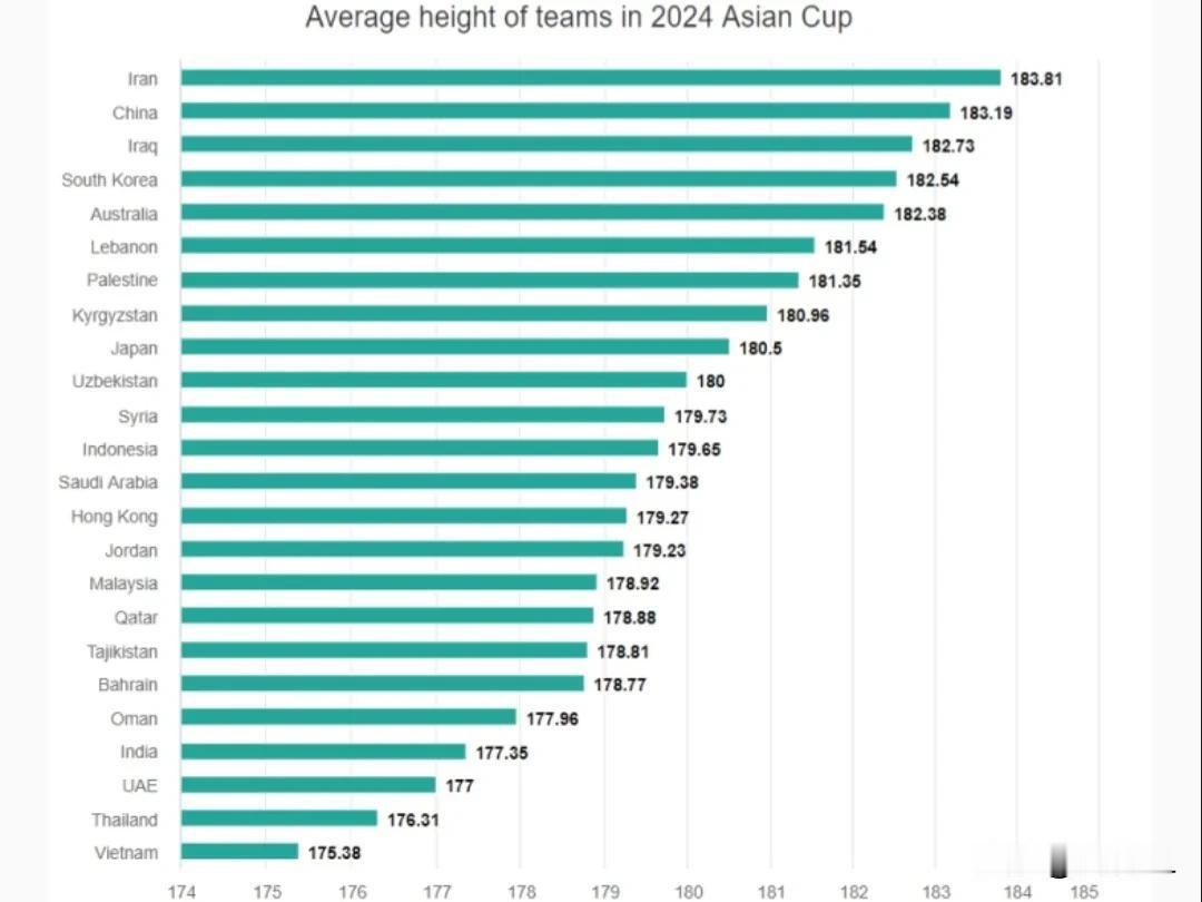 这是国足在亚洲杯所有有球队中唯一名列前茅的一项,可惜现在的国足已经没有能力去运用。 据亚足联统计,在参加卡塔尔亚洲杯的所有24支球队中,国足以平均183.19cm的身高仅次于伊朗(183.81cm)排名第二,最矮的球队是国足苦主越南队,平均身高176.3cm。