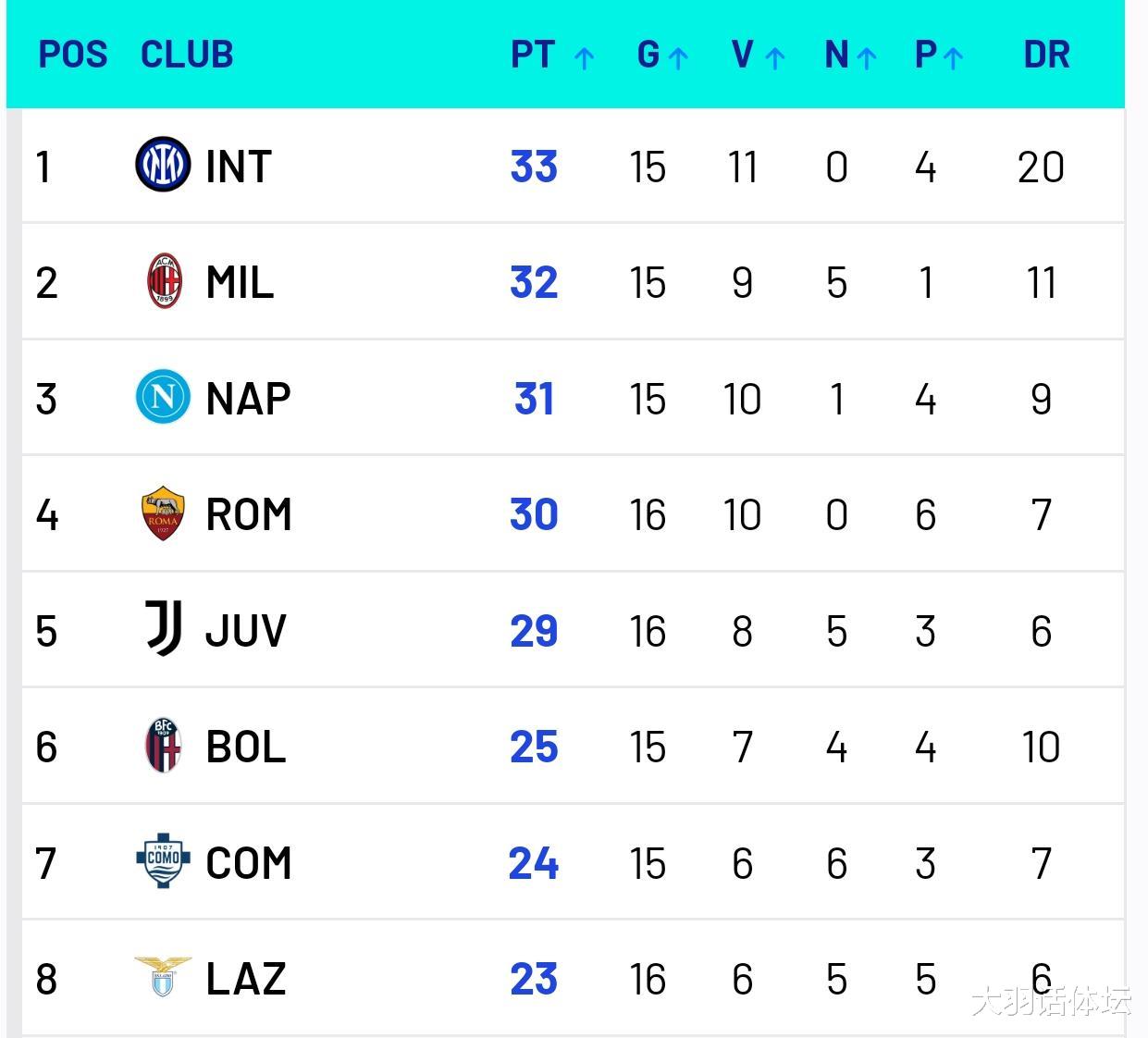 由于米兰双雄、那不勒斯、博洛尼亚均在沙特参加了本赛季的意大利超级杯,这4支球队都因此缺战了意甲第16轮比赛。截至目前,少赛一场的国米、米兰和那不勒斯排名积分榜前3位,罗马、尤文位列4-5名,前5名的积分等差1分,竞争十分胶着。