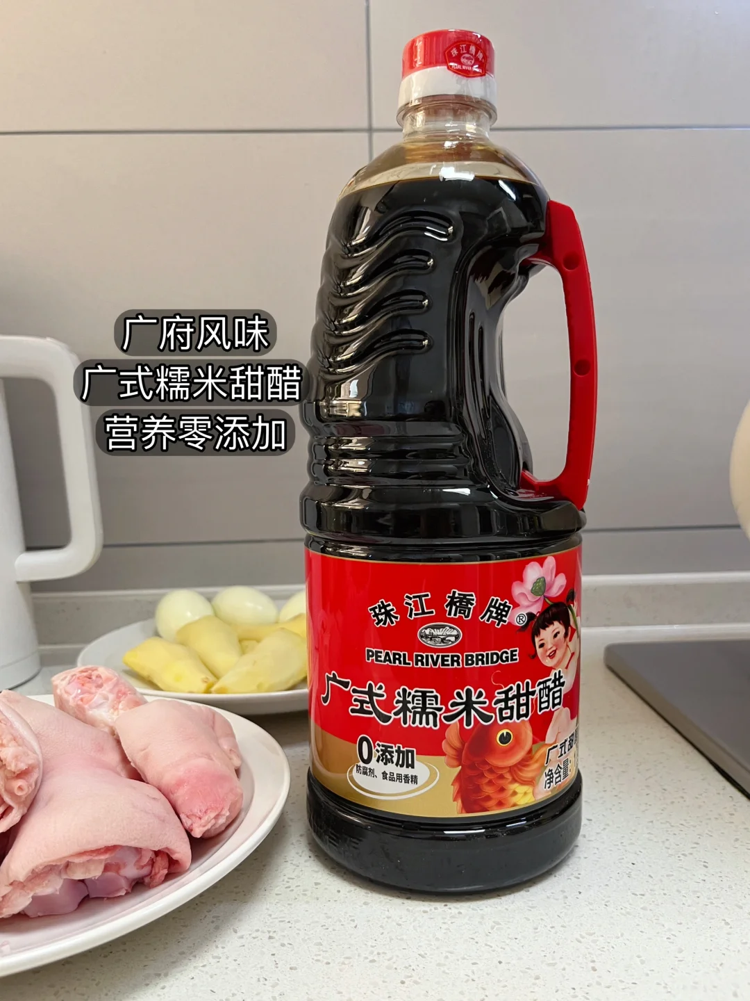[种草R]这道菜看着好像很繁琐实则很简单,上手就会。需要提前准备好它的灵魂调料“珠江桥牌广式糯米甜醋”,广东老字号味道很正,配料也干净是0添加的一款甜醋,炖的时候不放糖不放水就能做出一锅正宗猪脚姜~今天炖的猪脚软糯q弹,配大米饭一绝~泡在醋汁里的鸡蛋也很入味,还有平时我们家里人喜欢的糖醋口味,用它调制出来的酱汁酸甜开胃,全家人都喜欢~