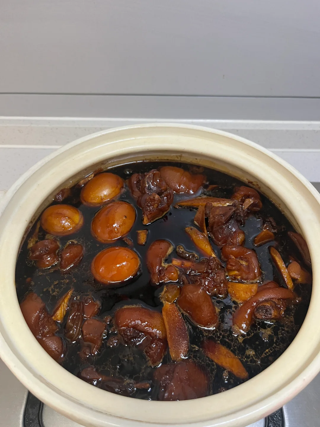 4️⃣砂锅放入猪脚,姜,红糖,加入甜醋没过食材,开火,烧开后转小火炖40分钟。