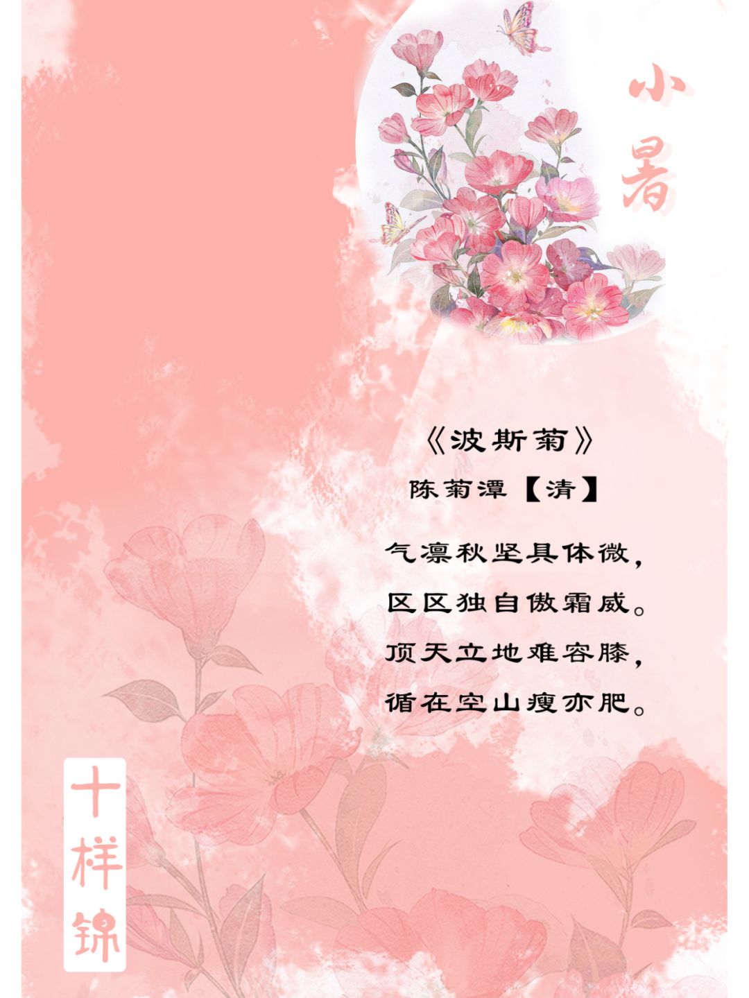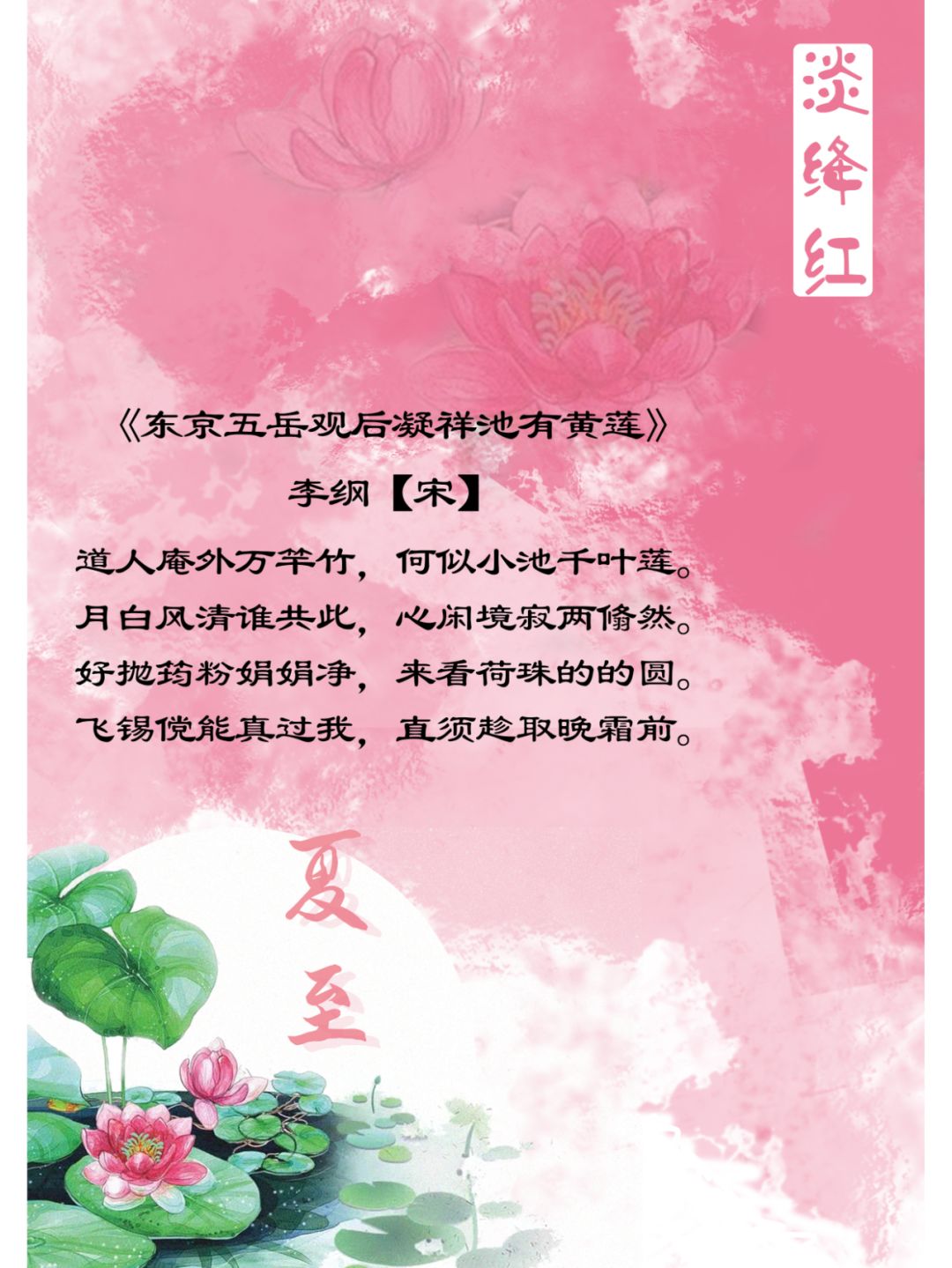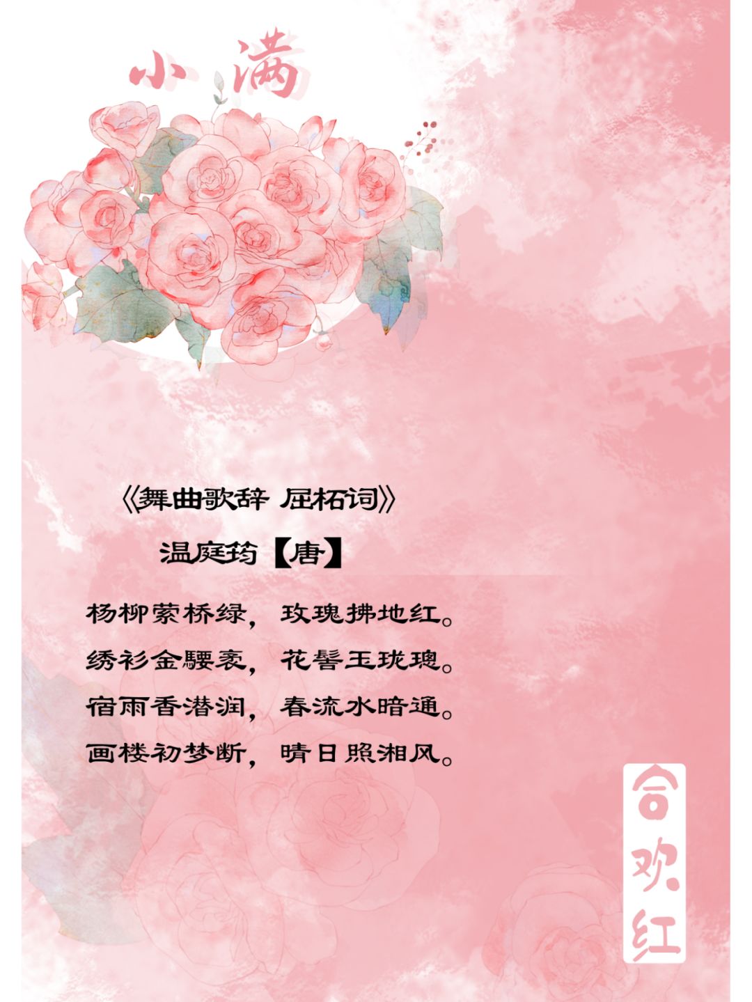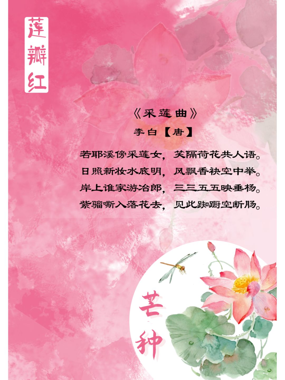 中国传统色之二十四节气(花篇二) 每年逢四、五、六、七月,恰是中国最炎热的阶段 艳火娇阳,太阳红光满照,夏季的颜色便是那耀眼的“赤色” 所以,本期的时节颜色主打“赤色”系列的中国传统色 五月 立夏 芍药 小满 玫瑰 六月 芒种 荷花 夏至 睡莲 七月 小暑 波斯菊 大暑 彼岸花 春梅红 RGB:241、147、156 CNYK:0、56、27、0 合欢红 RGB:240、161、168 CNYK:0、50、230、0 莲瓣红 RGB:234、81、127 CNYK:0、80、27、0 淡绛红 RGB:236、118、15 CNYK:0、68、21、0 十样锦 RGB:252、177、170 CNYK:0、30、33、1 唐昌蒲红 RGB:222、28、49 CNYK:0、93、76、0 素材来源:堆糖、小红书、百度 制作工具:PS 中国传统色网站: (1)http://zhongguose.com/#yanhong(中国色--中国传统颜色) (2)http://www.2kil.com/(中国传统颜色|中国色)
