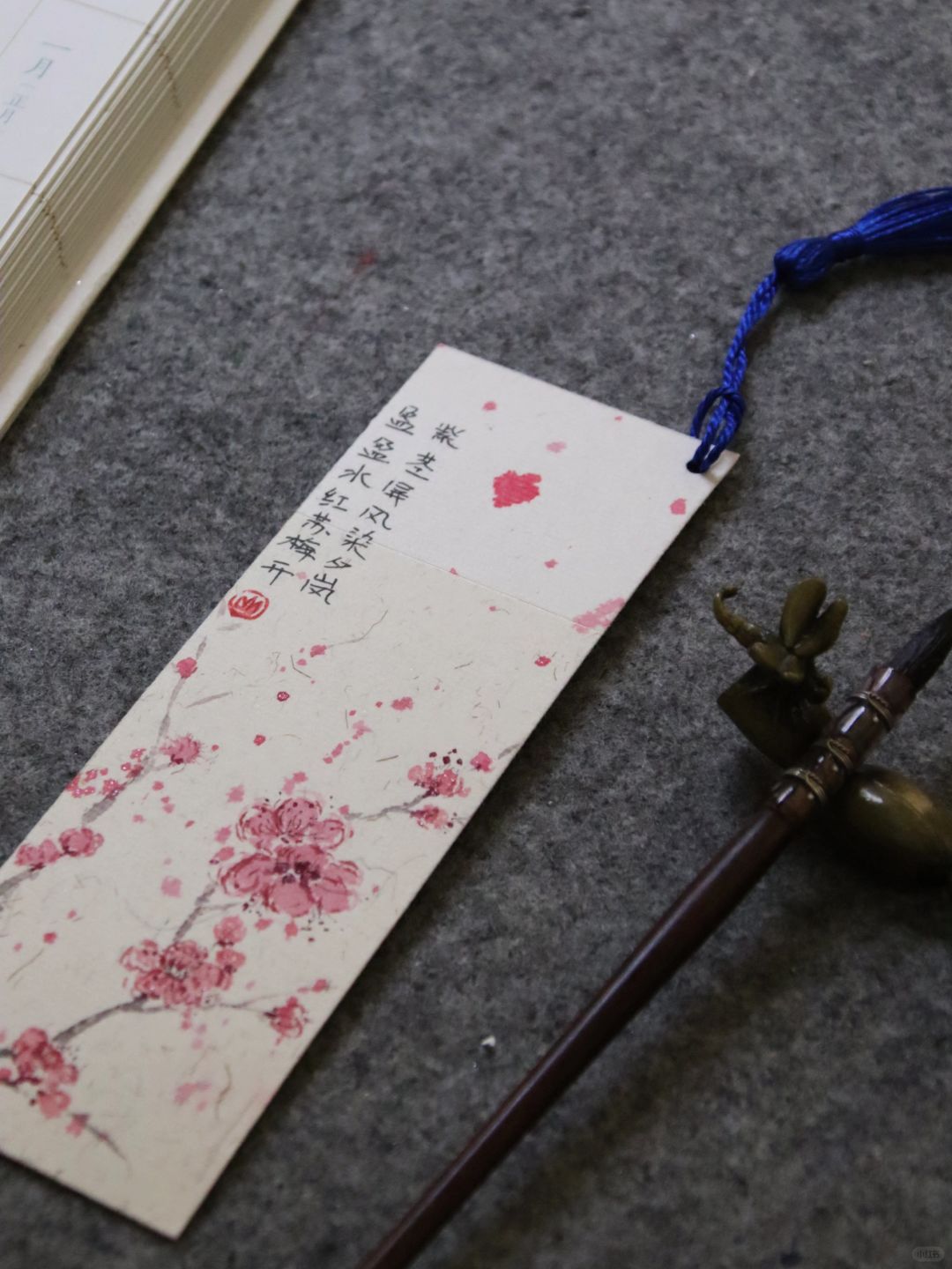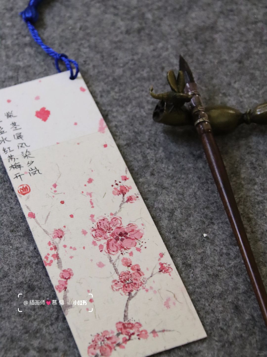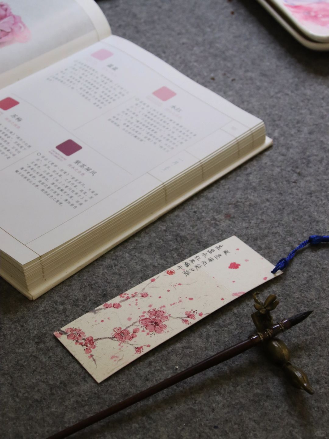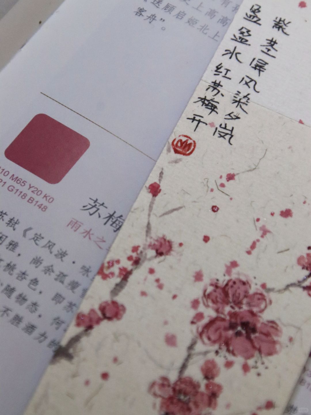 💗【盈盈】雨水之起色 “盈盈一水间,脉脉不得语”,最美中国色之盈盈,色若桃花映水,皎容顾盼,清丽娇俏。盈盈,是少女的颜色,更是美好的存在。 💗【水红】雨水之承色 浣溪纱·前题 曾廉〔清代〕咏“栴木应前绿树新。水红衫子藕丝裙。春来多少冶游人”。 杨尧善《题武夷》咏“慢亭烟带凌霄紫,玉女霜华照水红”。 卫宗武《春怀》“柔绿尚含滋,水红悭破萼”。 💗【苏梅】 语自苏轼《定风波·咏红梅》“偶作小红桃杏色,闲雅,尚余孤瘦雪霜姿”。苏轼笔下红梅之小红桃杏色,即苏梅的颜色。 💗【紫茎屏风】雨水之合色 语出白居易《池上小宴问程秀才》“净淘红粒詈香饭,薄切紫鳞烹水葵。雨滴篷声青雀舫,浪摇花影白莲池”。薄如紫色鳞片的紫背红水葵,颇得此色之意境。 以上选自《中国传统色》故宫里的色彩美学。色谱是意象,花儿是具象,此两维度,寻找失落的中国颜色词! 书签~自制宣纸卡纸书签➕颜彩国画颜料➕鲁本斯银色闪粉