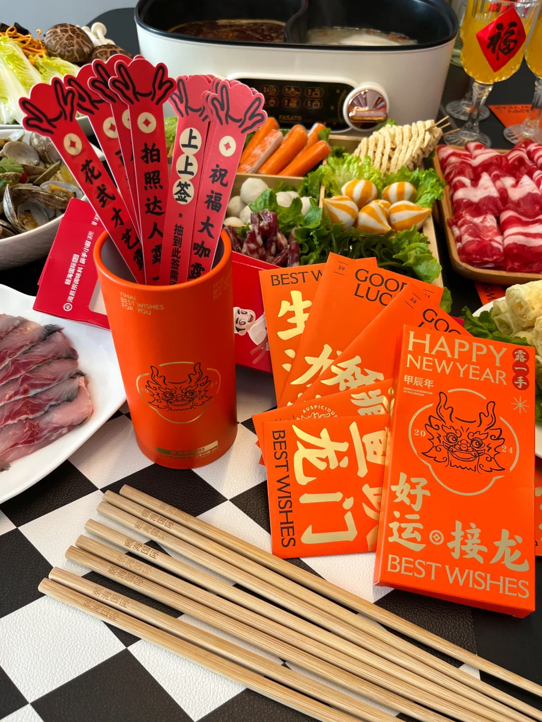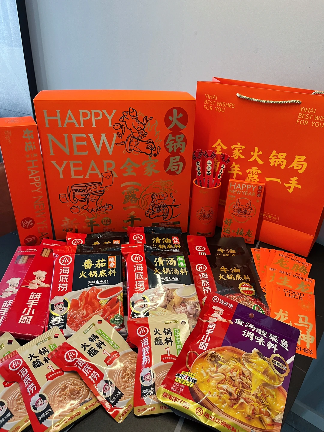 礼盒里还包含了好多新年的周边,好运签筒和接龙红包还能跟家人一边吃火锅一边互动起来简直不要太开心~热闹的新年氛围一下就拉满了~