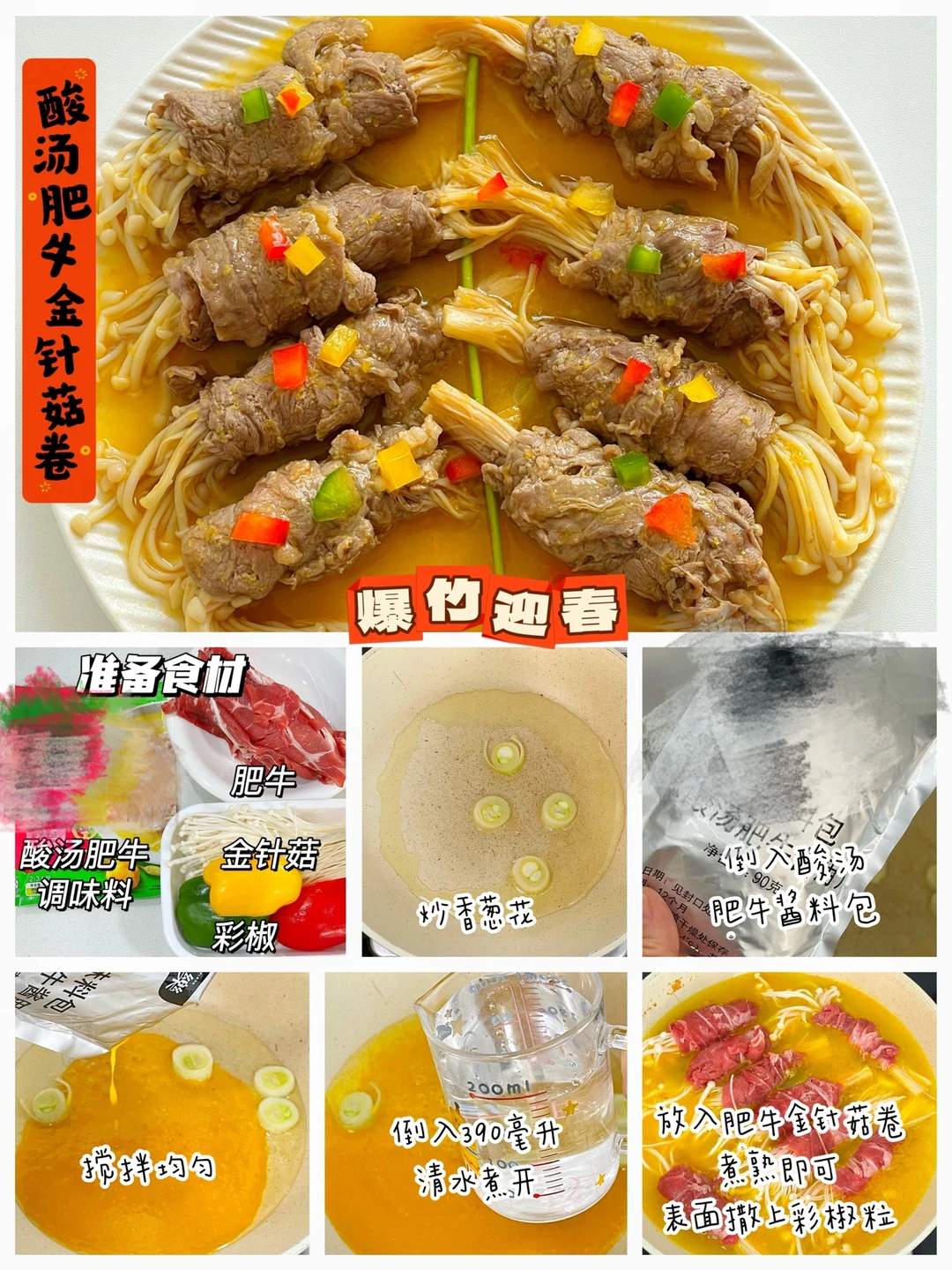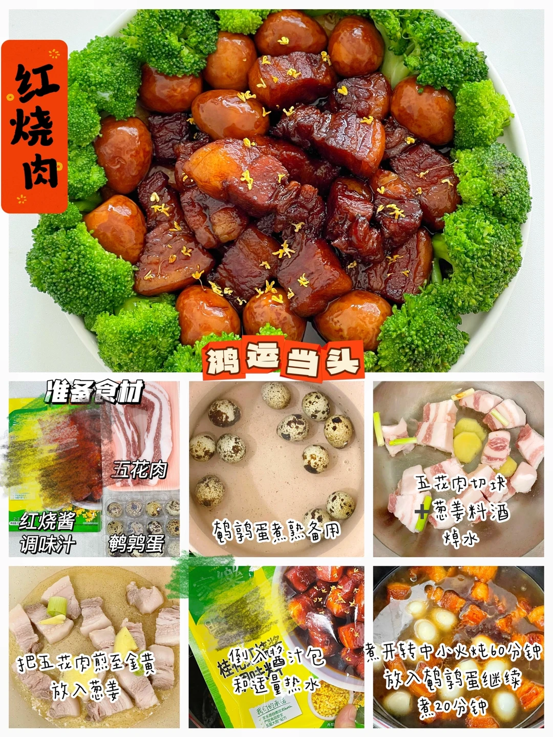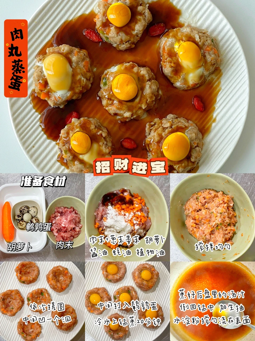 马上就到农历新年了,年夜饭菜单也要着手准备了,今天分享12道寓意好味道也好的菜品,可以供大家参考一下哦~ 🧧1百财聚来 (翡翠白玉卷) 肉末加料酒、生抽、蚝油、芝麻油、香菇和胡萝卜搅匀。白菜煮软包住肉馅卷成卷,水开蒸20分钟。生抽加水淀粉煮开淋在表面。 🧧2年年有余 (清蒸鲈鱼) 鲈鱼处理好放葱、姜、料酒腌制15分钟。蒸锅蒸12分钟,盘里的汤汁倒掉,摆上新的葱、姜丝,一勺生抽,淋上热油即可。 🧧3金玉满堂 (什锦虾仁) 荷兰豆、豌豆、玉米、胡萝卜焯水备用。虾仁用胡椒粉料酒腌制。炒香葱花放入虾仁炒变色,放入其他食材翻炒一下,加水淀粉、盐调味即可。 🧧4团团圆圆 (冬瓜蒸肉饼) 肉末+山药丁混合,加生抽,少量多次倒入葱姜水,搅拌上劲,盘子底部摆冬瓜,中间放上肉饼,水开蒸20分钟。 🧧5甜甜蜜蜜 (南瓜糯米饭) 糯米清水按照1:2的比例煮熟备用。南瓜切块摆在碗中,中间装满糯米饭,冷水上锅蒸20分钟,倒扣在盘上。调一个汤汁淋在表面(白糖+清水+淀粉搅匀煮开,关火加枸杞) 🧧6笑口常开 (红枣糯米糕) 制作:红枣切开不切断去核。100克糯米粉加90克热水搅匀揉成团,依次搓成椭圆夹在红枣中间。水开蒸20分钟。表面淋上桂花酱或撒白芝麻都行 🧧7蒸蒸日上(虾仁豆腐蒸蛋) 2个鸡蛋+100毫升温水搅匀撇去浮沫,玉子豆腐切片摆盘,表面倒入蛋液,水开蒸10分钟,再放入虾仁继续蒸5分钟,出锅淋上生抽香油. 🧧8.鸿运当头 (红烧肉) 鹌鹑蛋煮熟备用。五花肉切块+葱姜、料酒焯水。另起一锅油热放入五花肉煎至金黄放入葱、姜,打入红烧肉酱料包和适量热水,煮开转中小火炖60分钟放入鹌鹑蛋继续煮20分钟。 🧧9.爆竹迎春(酸甜金针菇肥牛卷) 肥牛中间放入金针菇卷成卷。炒香葱花倒入酸汤肥牛酱料包倒入300毫升清水煮开,放入肥牛金针菇卷煮熟表面撒上彩椒粒。 🧧10.大鹏展翅 (菌菇蒸鸡翅) 鸡翅+生抽、葱姜腌制20分钟。盘子底部摆上蘑菇,上面放鸡翅摆上葱、姜,水开上锅蒸20分钟。