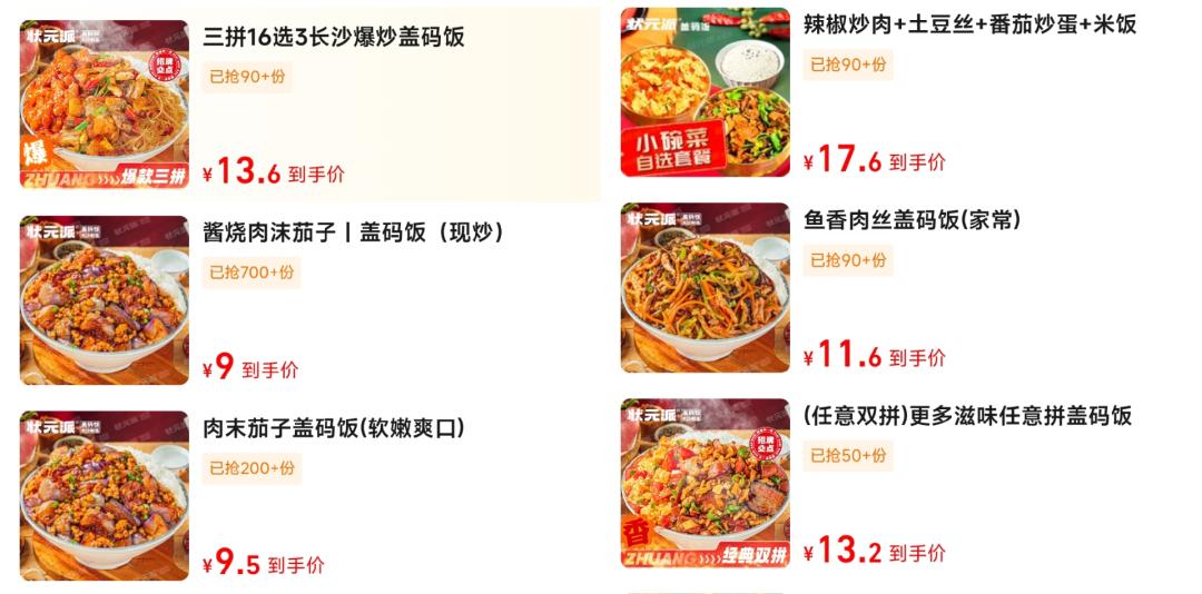 如果是外卖店盖码饭,那价格甚至算得上便宜。一份盖码饭最低不到10元,双拼盖码饭也不超过20元,部分盖码饭品牌门店推出的“一口价”产品,三拼盖码饭也只需要13.6元。