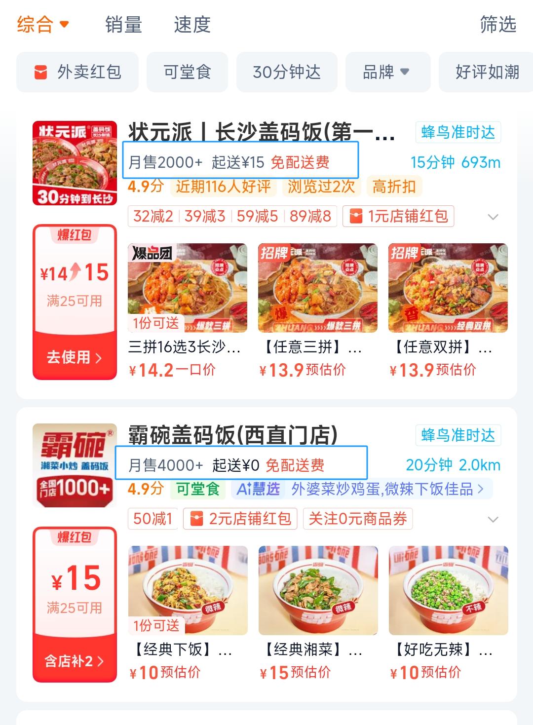 像林薇一样,成为盖码饭忠实粉丝的人并不少。这直接反映在盖码饭的销量上,定位到北京某区域,某外卖平台上盖码帮、状元派等盖码饭月售达2000+,霸碗盖码饭更是达到了月售4000+的销量。