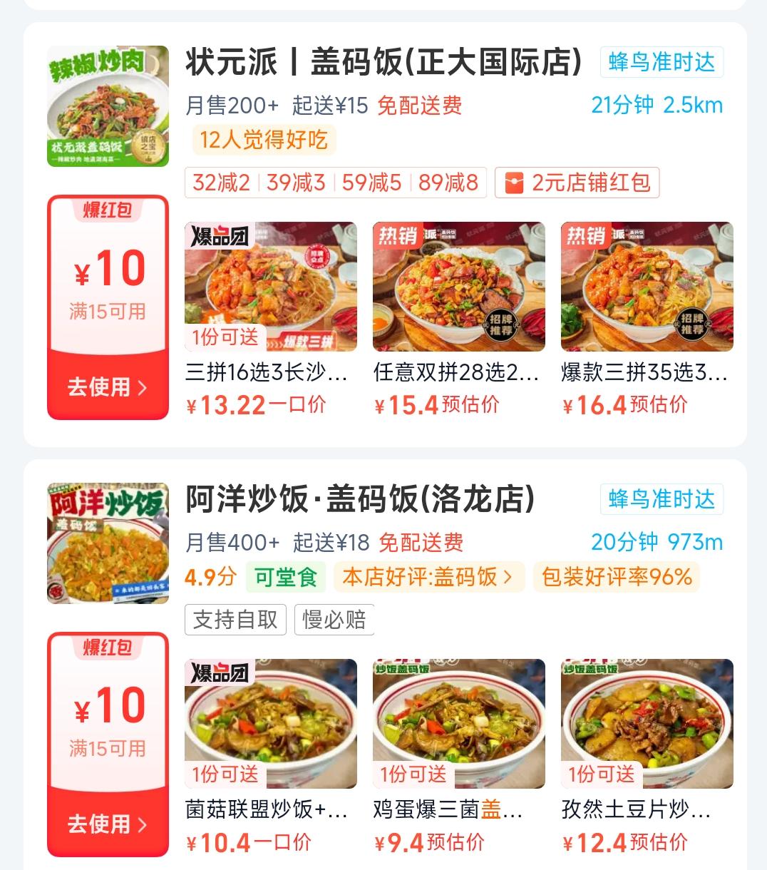 淘宝闪购上定位洛阳某地,搜索“盖码饭”,价格也是十几元|图源:淘宝闪购