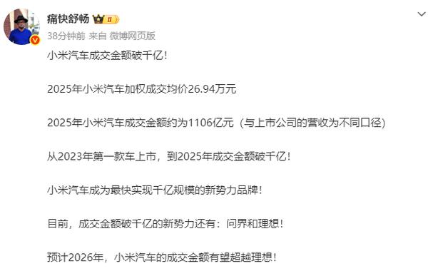 【CNMO科技消息】2月6日,有汽车博主透露,小米汽车在2025年的成交金额成功突破千亿大关,达到约1106亿元,加权成交均价为26.94万元。这一成就使小米汽车成为最快实现千亿规模的新势力品牌,与问界、理想共同跻身成交金额破千亿的新势力阵营。