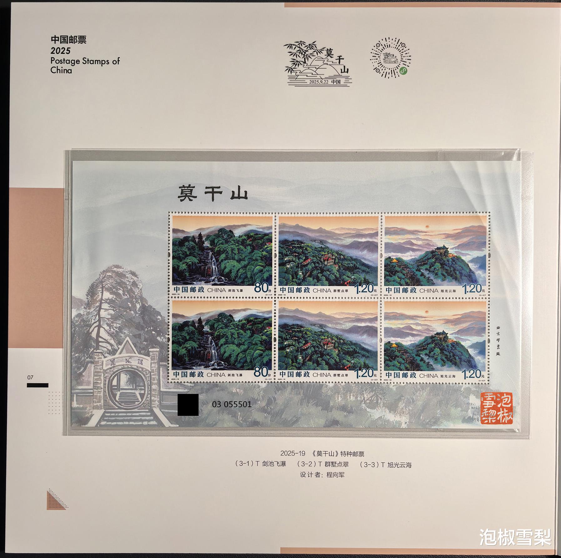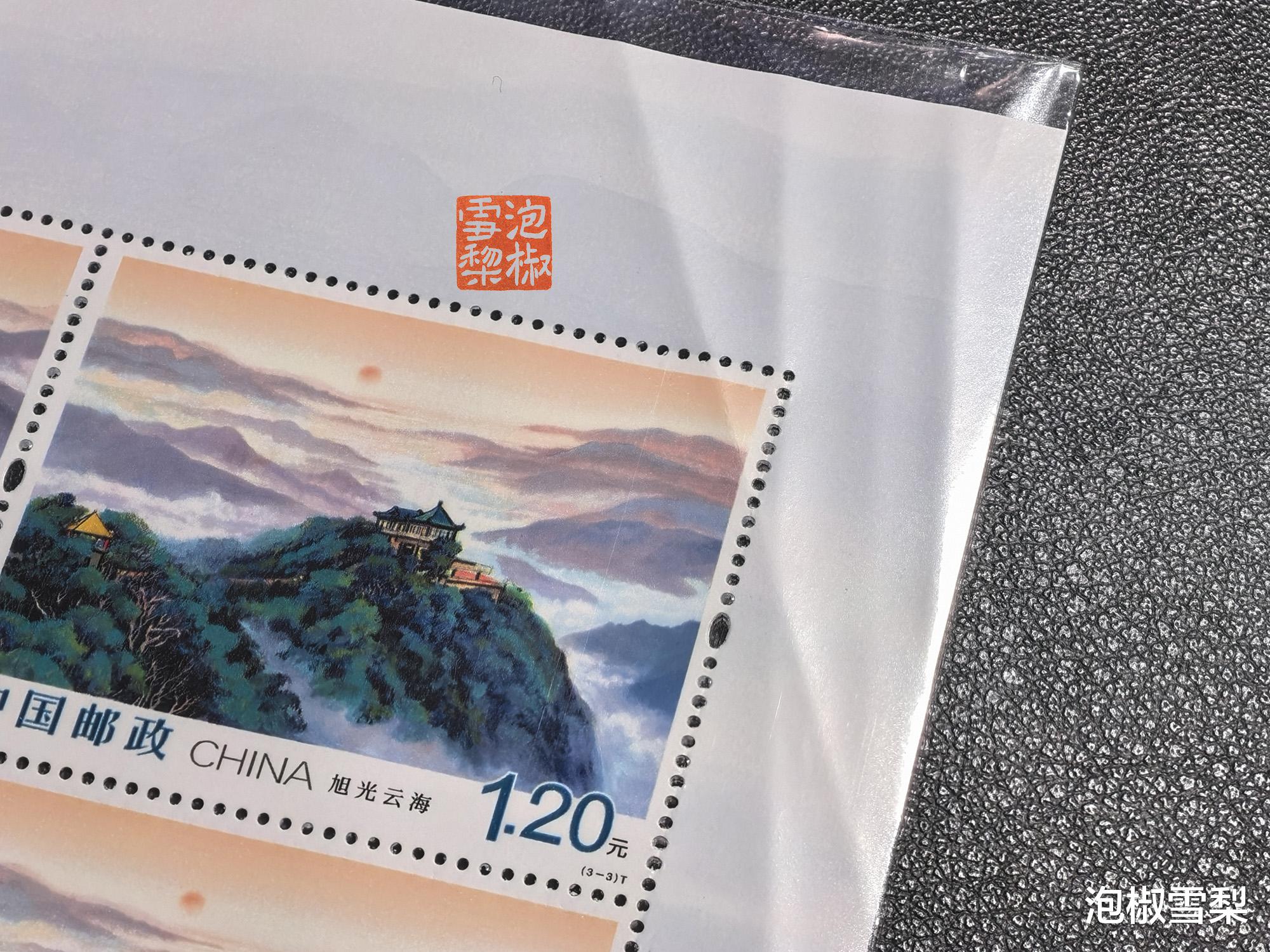泡椒雪梨第一次看到这种包装是在十五运会三地小全张上,最近拿到小版册和马生肖三地小全张后,发现这种包装已经成为一种标配,从小版册中的《莫干山》开始,所有的版票外边都增加了一层自封口保护膜。