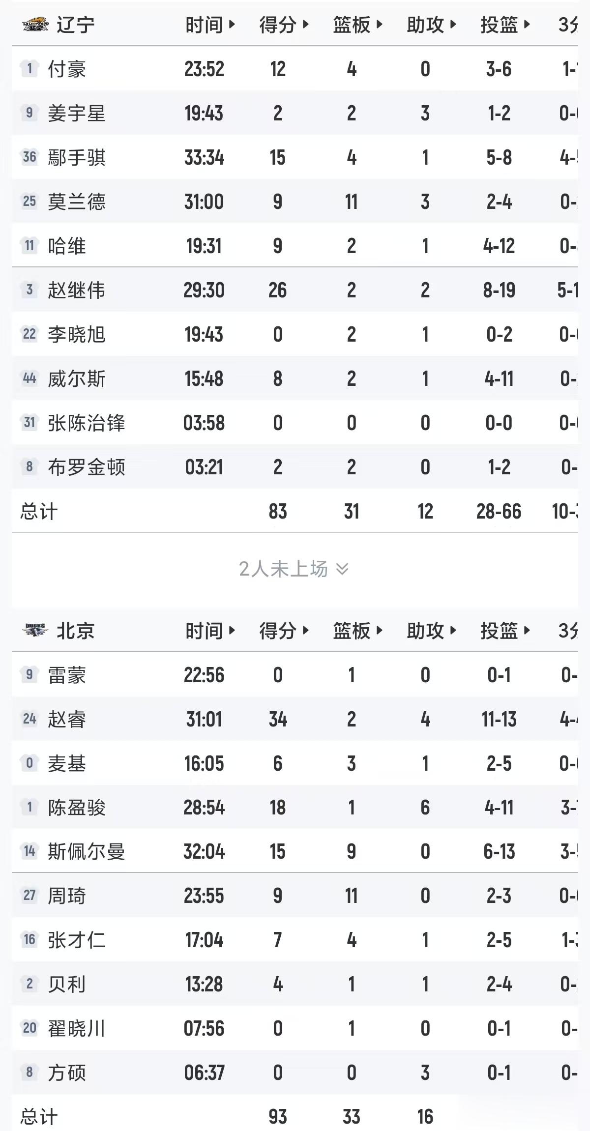 下半场比赛,赵睿连得10分开局追到还差1分,辽宁被迫叫停比赛,比赛继续莫兰德失误,赵睿上篮反击反超比分,随后两队比分交替上升,三节战罢辽宁落后3分。末节决战,赵继伟与赵睿三分对飙非常火爆,本节进行一半北京领先8分打停辽宁,周琦两罚全中分差来到两位数,随后辽宁没能逆转比赛,最终北京93-83击败辽宁,终结了辽宁队六连胜。