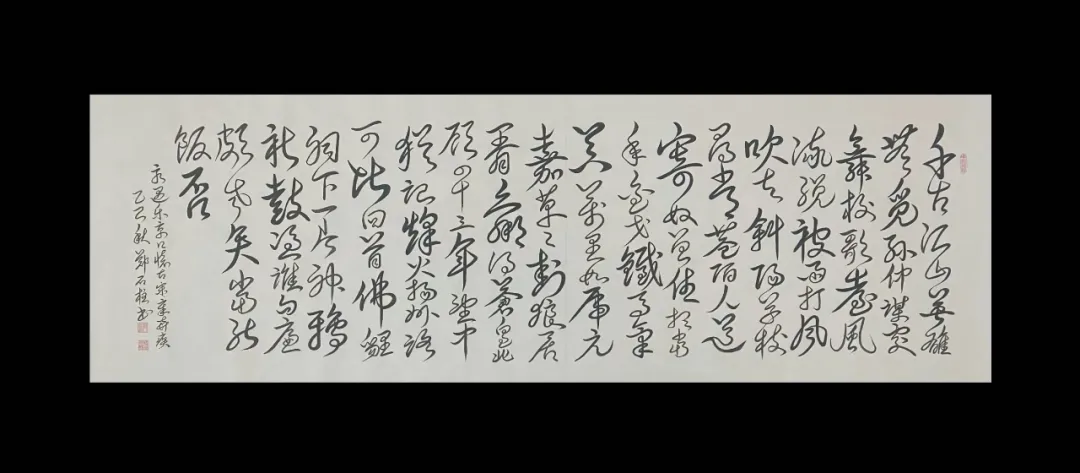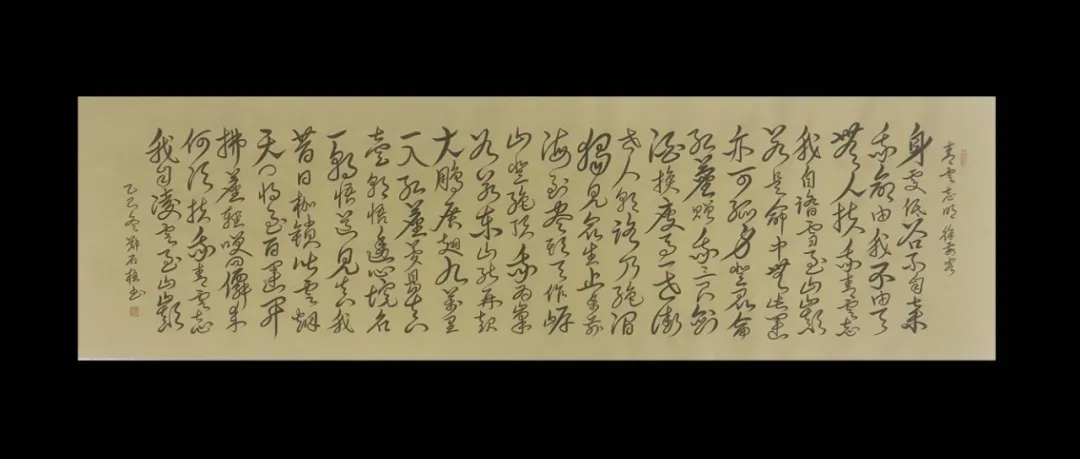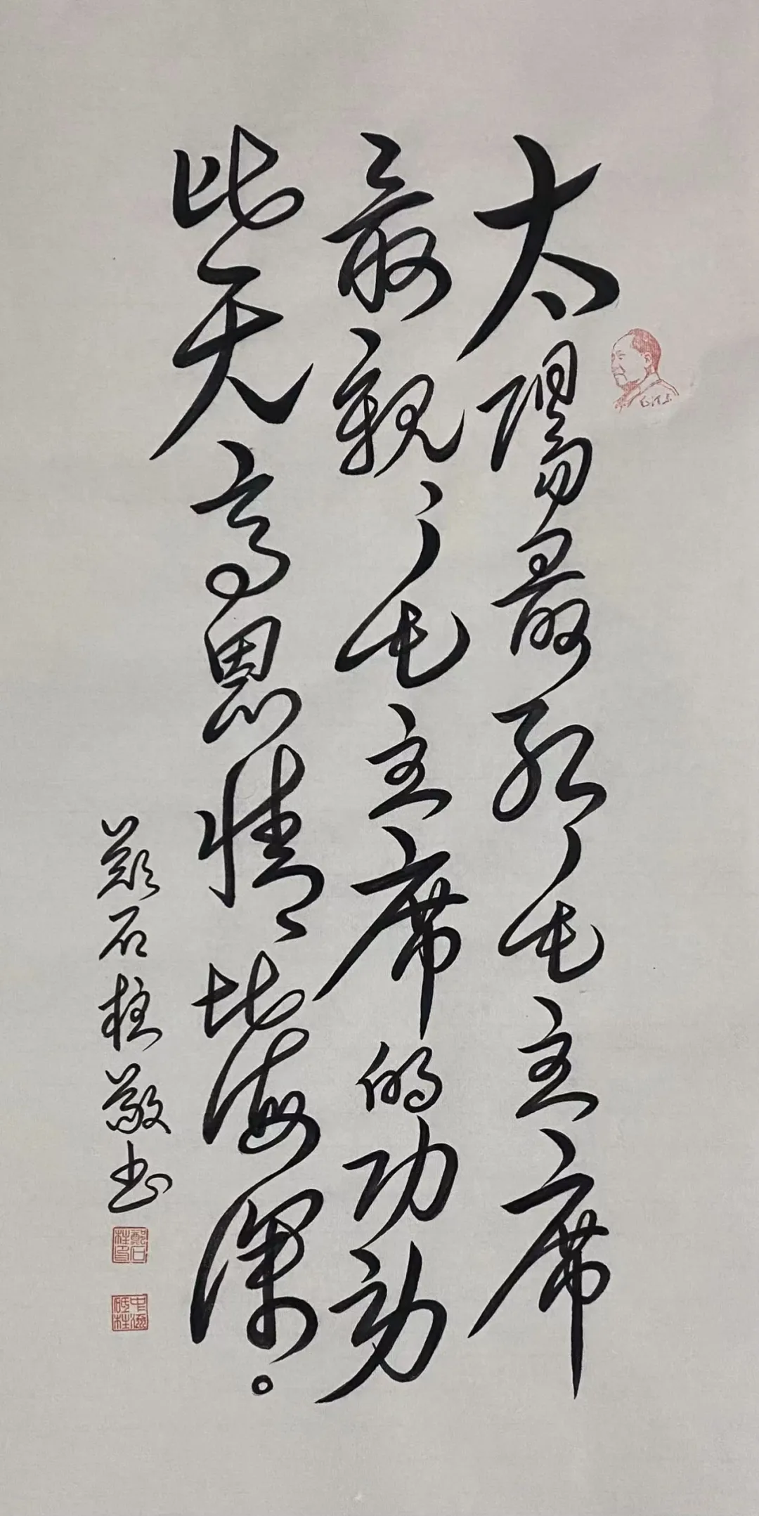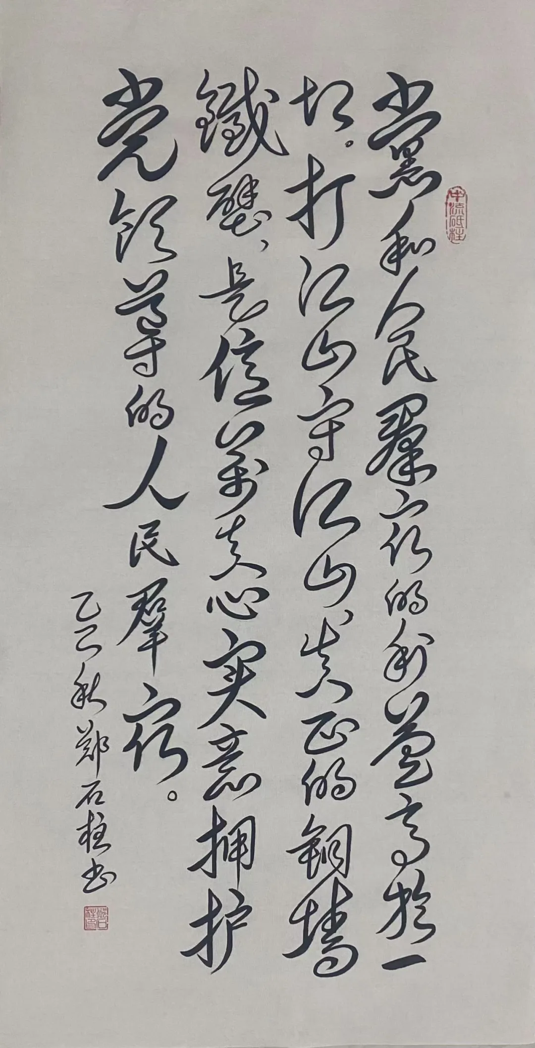 郑石柱长年热爱书法创作,尤为情钟历代经典行草作品的研习,日积月累,临池不辍,功底扎实。对毛体草书习练更是如痴似醉,心摹手追,逐步形成自己的书风。