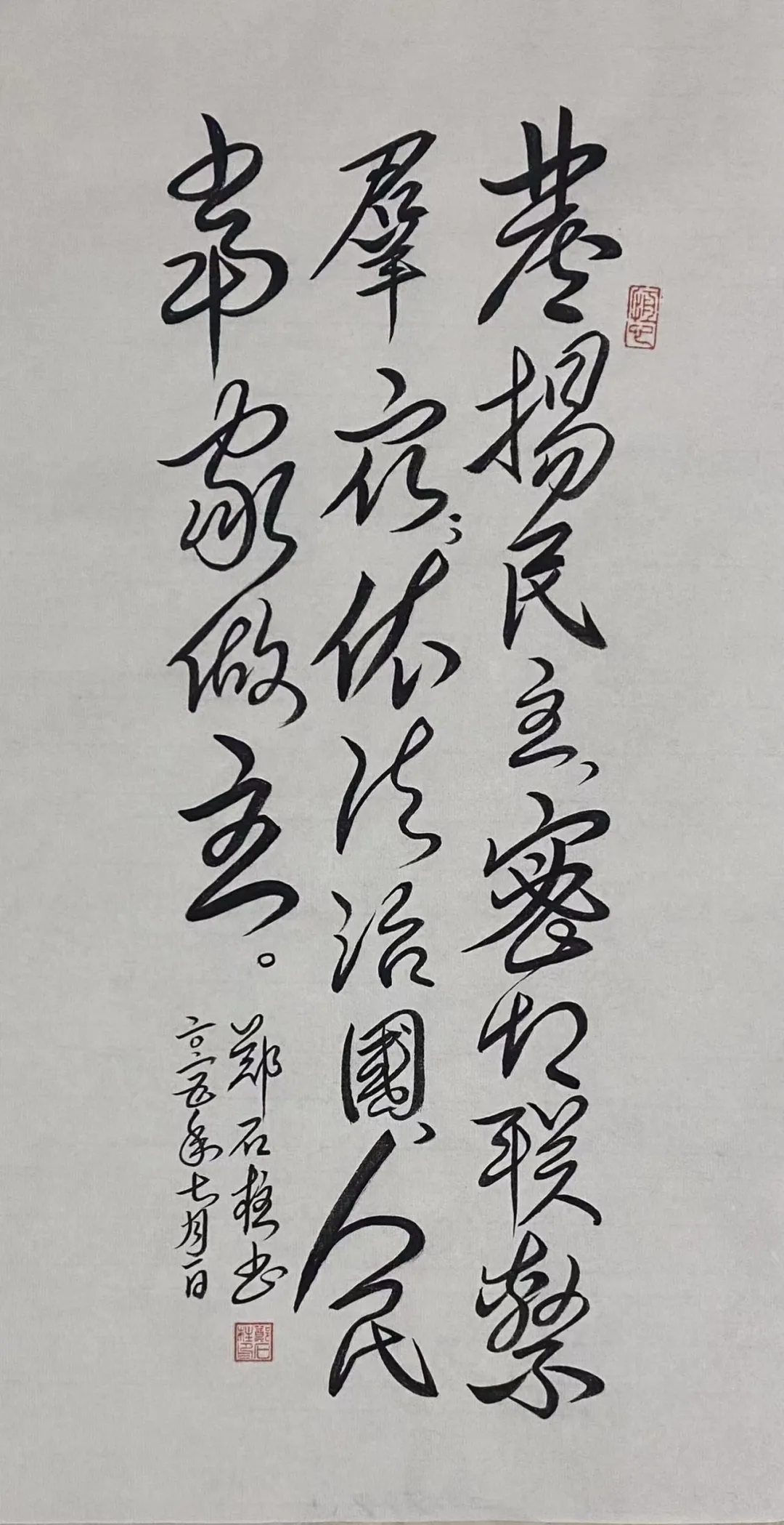 郑石柱任饶平县建筑工程质量安全监督站站长23年,作为建筑工程高级专家对线条、点、线、面及结构、造型,意象有着自己独特的体验与理解。其对书法艺术心生敬畏,严谨认真之工作精神潜移默化,自然而然地融汇在自己的创作实践中。揽观郑石柱的行草,毛体意蕴浓郁,结体严谨,布局规则,行云流水,笔走龙蛇,大气磅礴,气韵连贯,呈现出高妙的艺术驾驭能力,观之让人心生感慨,在美的享受中得到精神上的满足与艺术升华。其书法作品经国家邮政主管部门严格审核,入选《盛世华诞》《建国伟业》一庆祝中华人民共和国成立75周年》,《千年册页、百年邮政》《铭记历史、珍爱和平》《国礼名家邮册》一纪念中国抗日战争暨世界反法斯战争胜利80周年、联合国成立80周年等,大型文献类珍藏邮册,作为有“国家名片”称谓的邮票邮品推出,国内外广泛发行,广受欢迎与赞许!