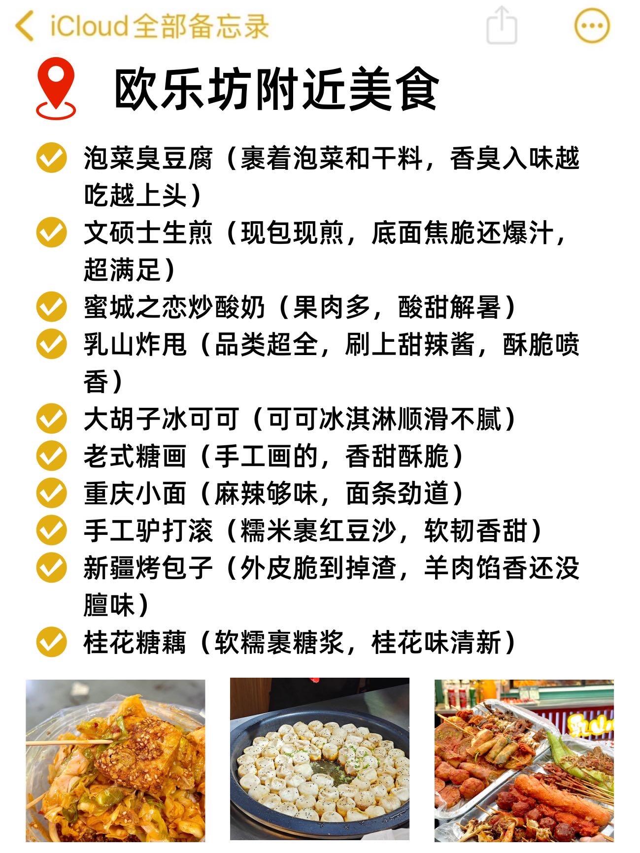 泡菜臭豆腐、文硕士生煎、蜜城之恋炒酸奶、乳山炸甩、大胡子冰可可、老式糖画、重庆小面、手工驴打滚、新疆烤包子、桂花糖藕
