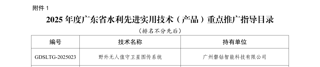野外无人值守卫星图传系统已成功入选《2025年度广东省水利先进实用技术重点推广指导目录》,其技术先进性与水利场景实用性获权威认可。