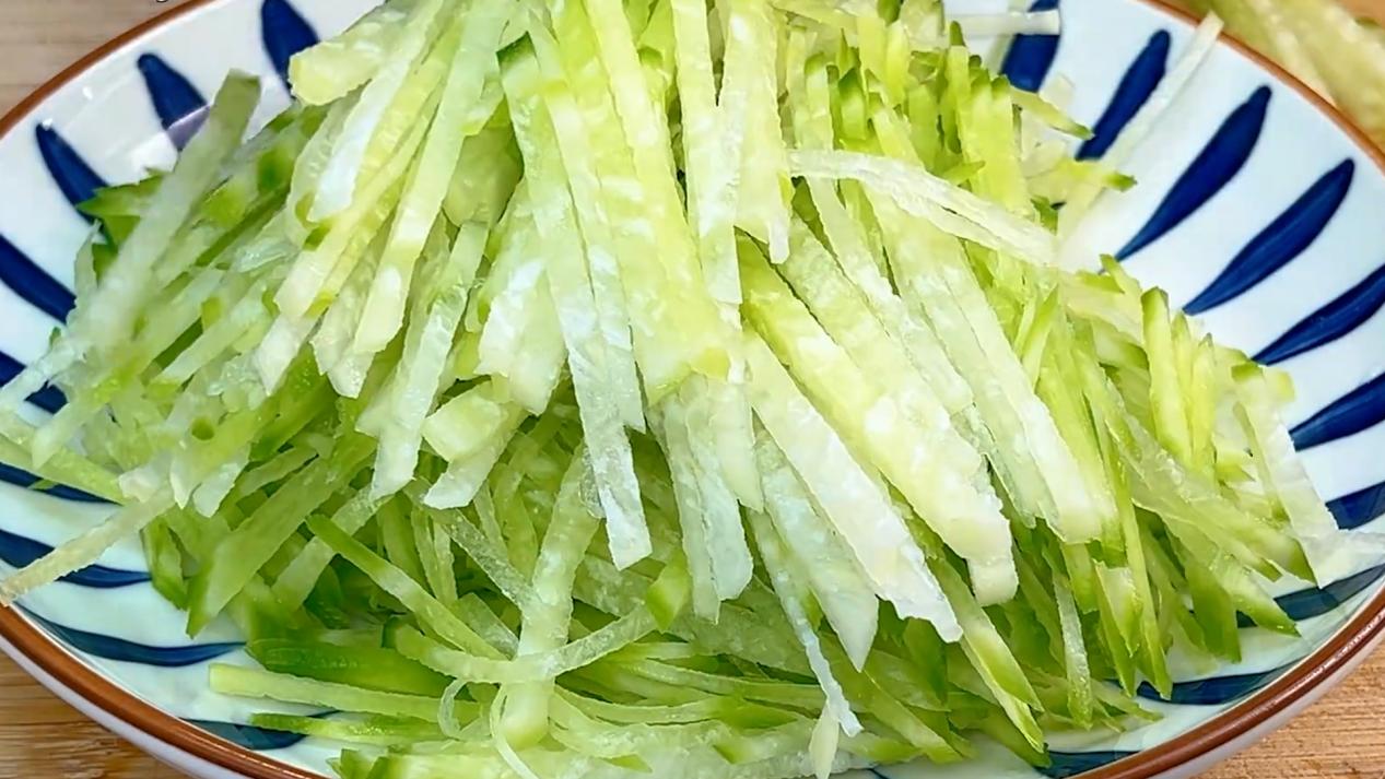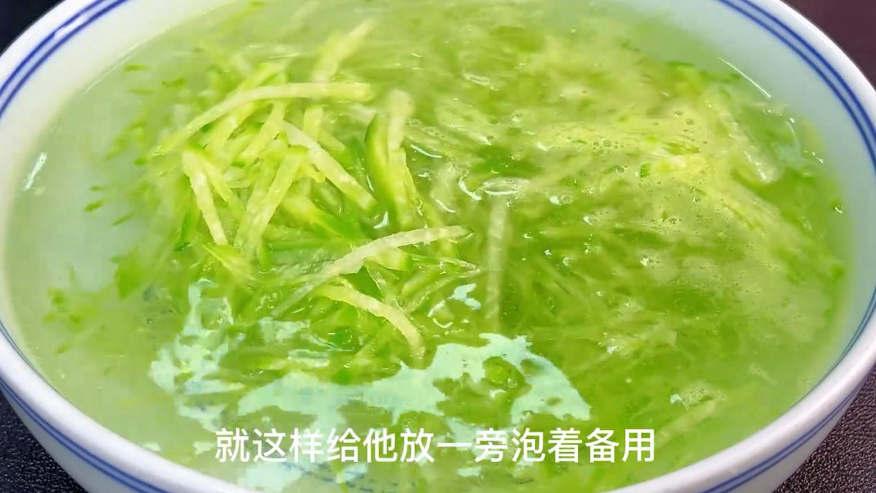 锅中水提前烧开,往里边加入一勺食盐,再加入一勺食用油,再把萝卜丝放入锅中,给它焯水两分中,水开放凉水中过凉备用。