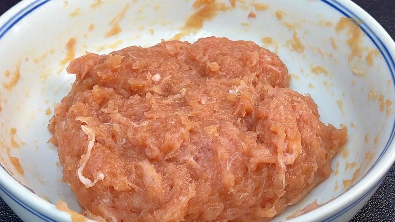再准备250克猪肉末。调一下味,往里边加入两勺生抽,加一勺蚝油,加一勺食盐,加适量的胡椒粉,再倒入30克左右的葱姜水。搅拌至肉馅上劲,让肉馅把这些料汁完全吸收。