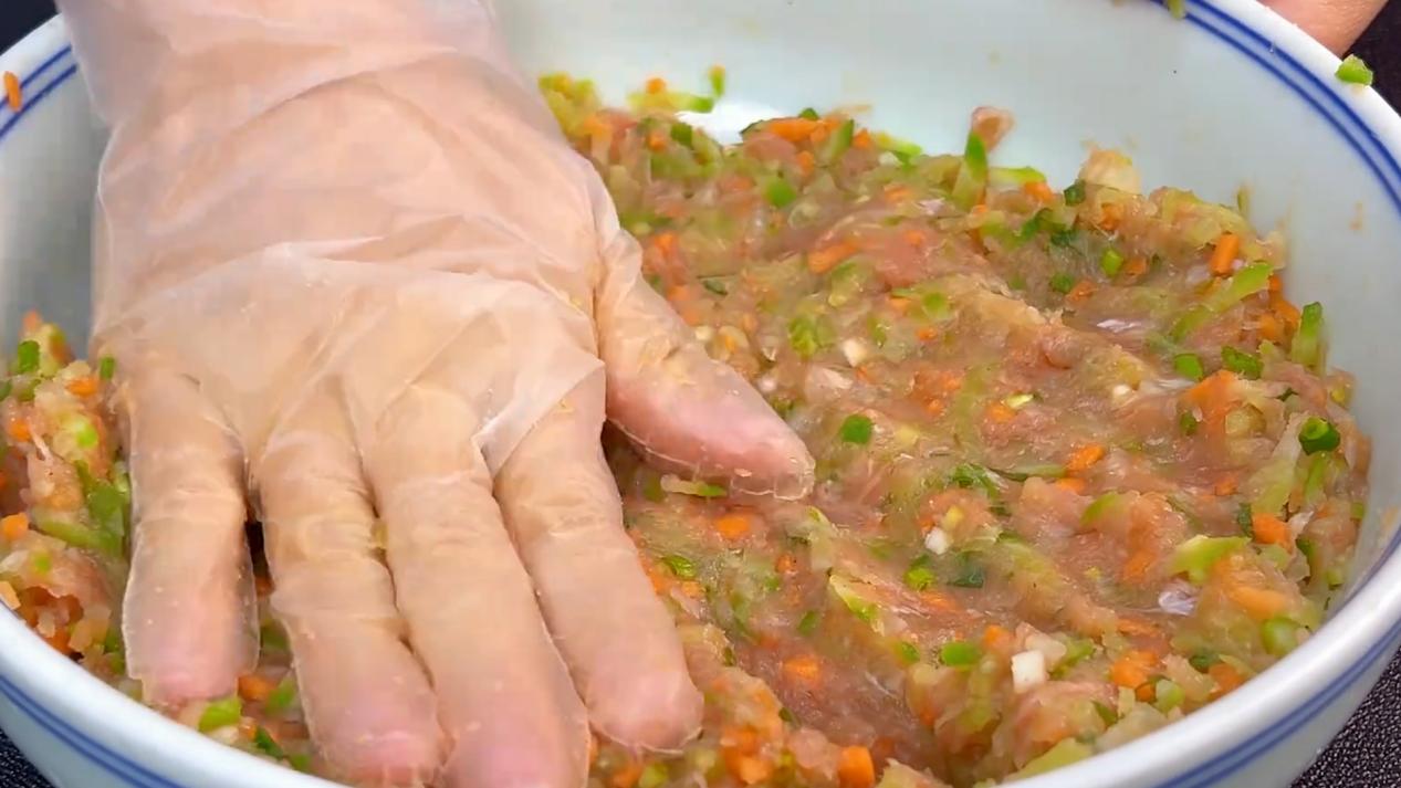 萝卜丝控水捞出,用力挤干萝卜丝的水分,再把萝卜丝放到案板上,用刀把萝卜切成小段,切好之后放肉末的碗中,再加入胡萝卜丁和葱花。然后下手抓拌均匀