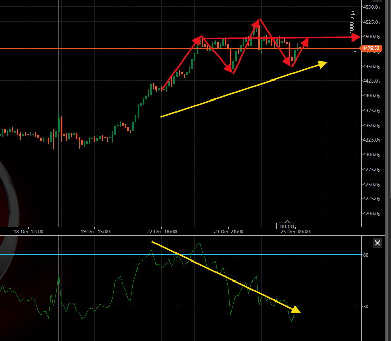 黄金的1小时图,头肩顶形态已初步形成。参考左肩在4500附近的压制,周五右肩大概率也在4500附近。如果能站上,咱们按原计划走;站不上的话,等回调再接多(这个区间也可以考虑做空),指标方面已经出现顶背离,别去追高,价格方面还没有出现修正,警惕诱多。