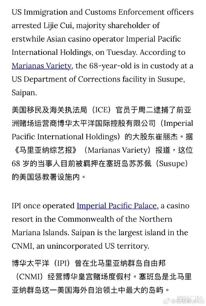 根据塞班岛当地权威媒体《马里亚纳综合报》报道,崔丽杰因涉嫌违反美国移民法规,于 1 月 13 日遭 ICE 旗下的海关执法与遣返行动处(ERO)拘留,目前关押于塞班岛苏苏佩(Susupe)矫正署设施内。