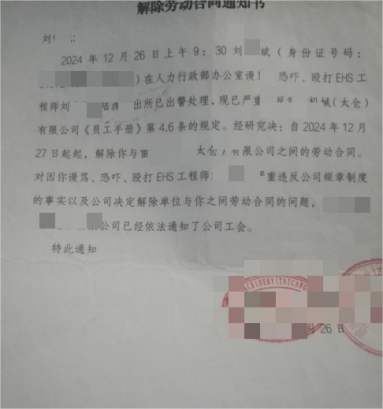 (解除劳动合同通知书,刘先生提供)