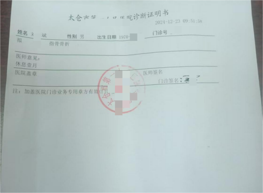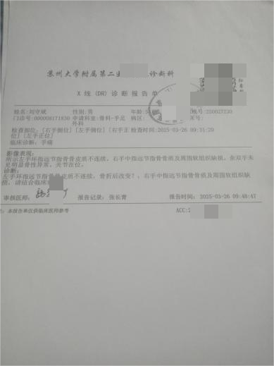 2024年12月22日下午,刘某斌在太仓市第一人民医院挂骨科手足门诊号,因号源满未就医。次日上午复诊,被诊断为指骨骨折,予夹板固定、换药并开具一个月休息证明。2025年3月26日复查显示,其左手环指远节指骨骨折后改变,右手中指远节指骨骨质及软组织缺损。