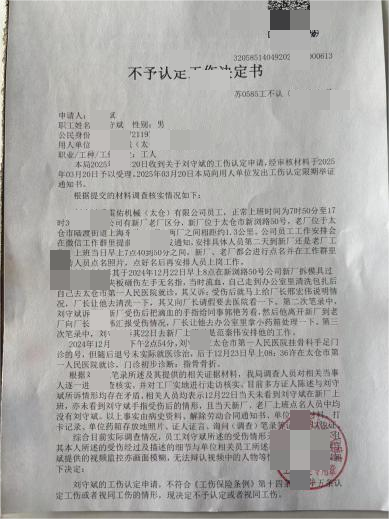 2025年3月20日,太仓市人力资源和社会保障单位收到刘某斌的工伤认定申请并予以受理。然而,在有充分材料证明下,该单位还是作出了《不予认定工伤决定书》。