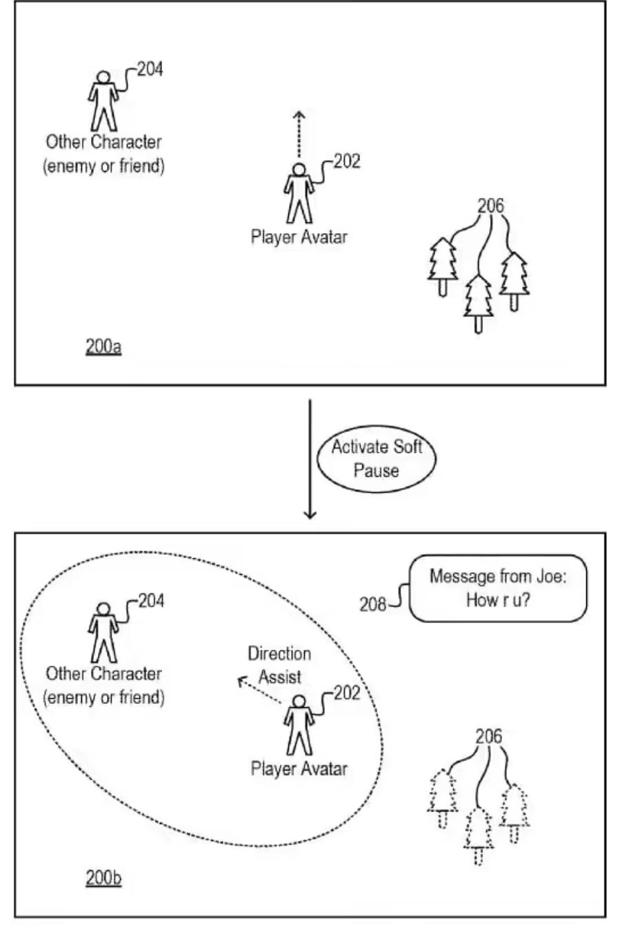 索尼在专利描述中详细讲述了这项功能的用途:将电子游戏的执行模式从正常模式切换为软暂停模式,该模式下游戏将继续运行,但会通过一项或多项手段降低玩家的游戏强度。