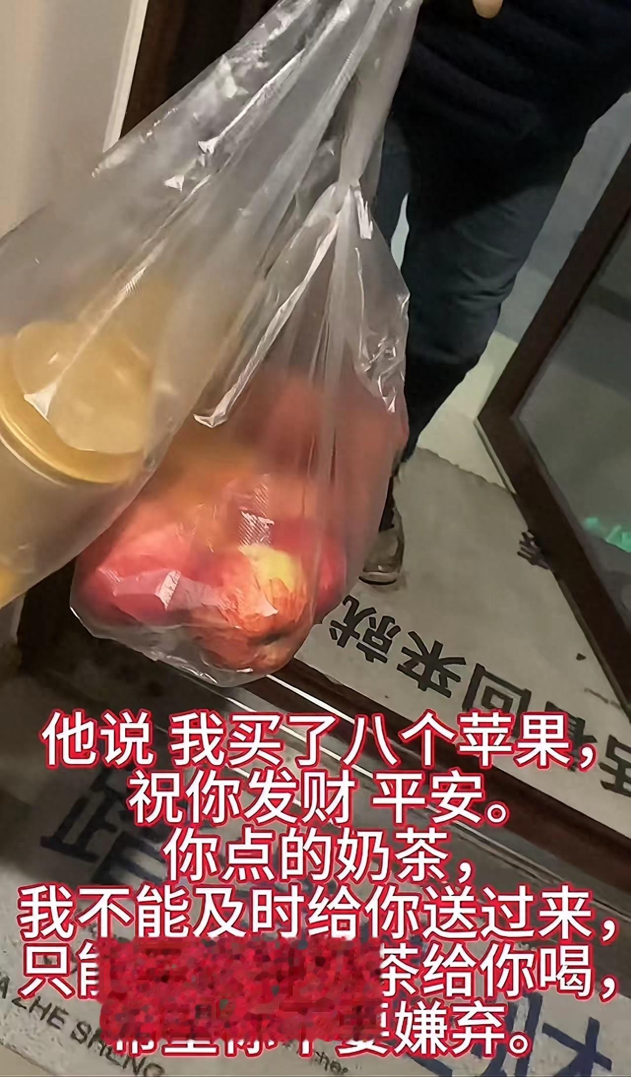 外卖大哥却认真地说:“姐姐,你听我说。这些苹果代表平平安安、财源广进。奶茶我没能送到,心里很不是滋味。今天跑了五公里,就是想感谢你的理解和善良。你能接受我一点心意吗?”