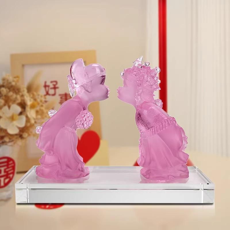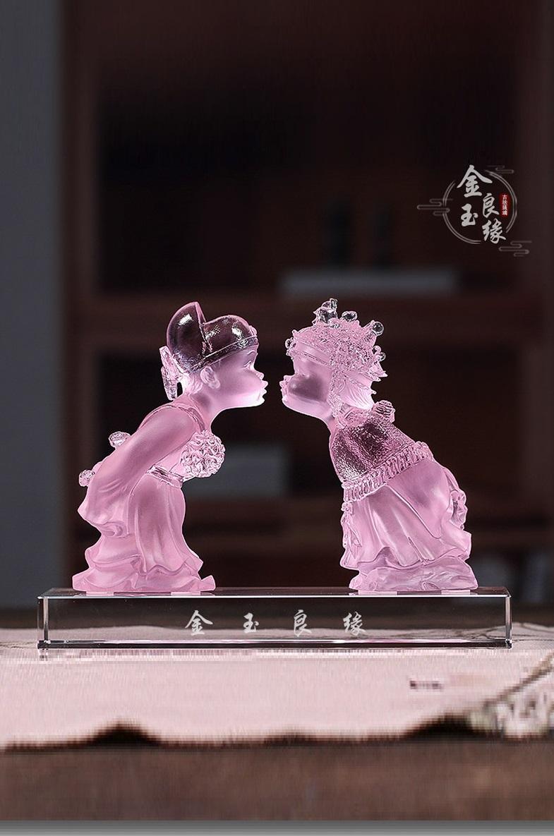 琉璃金玉良缘摆件在造型设计上独具匠心,蕴含着丰富的文化内涵与美好寓意。是对新人婚姻生活的美好祝福,也象征着家庭的和睦与繁荣,表达了对生活的热爱与向往 。这些造型通过琉璃的独特质感展现出来,更加生动逼真,让人感受到美的享受,也让人们在欣赏摆件的同时,对美好生活充满期待。