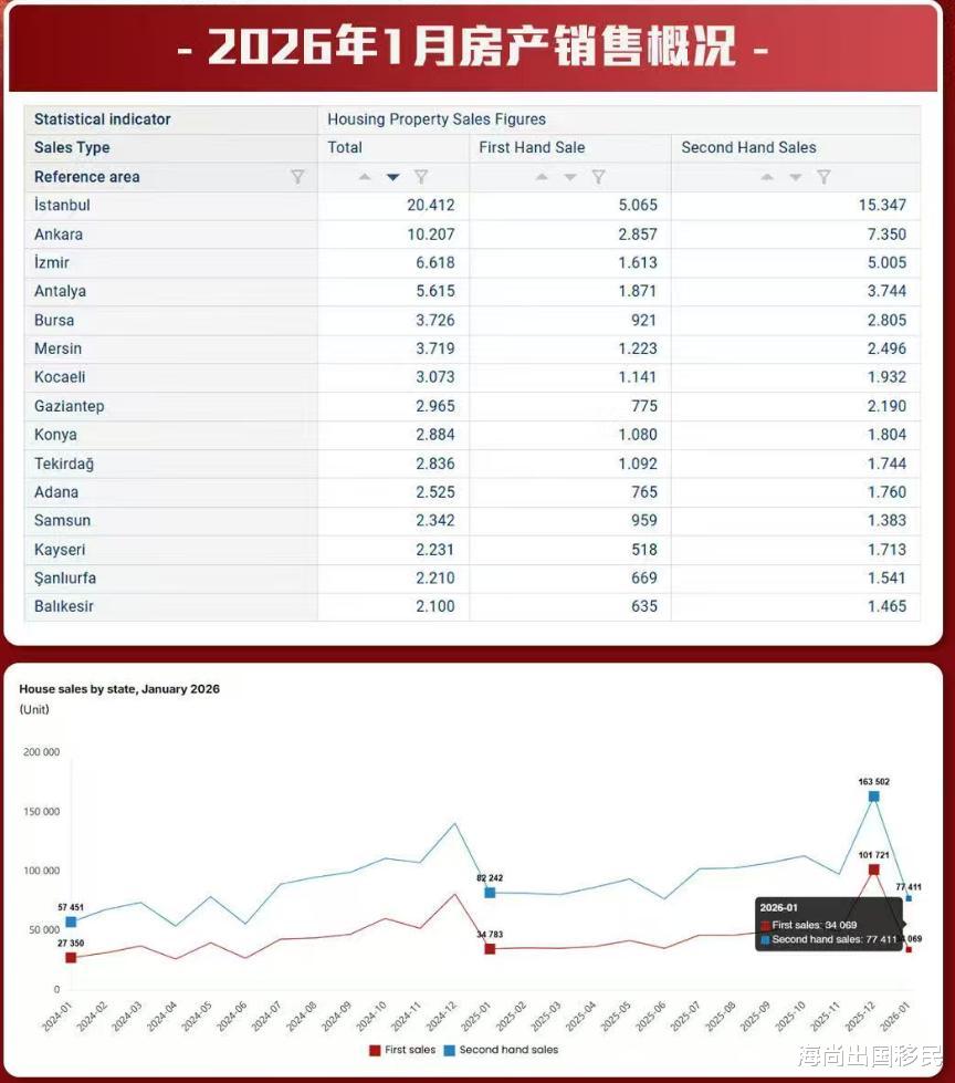土耳其房产数据 2026年1月销售总量略下降土耳其房产数据土耳其统计局(TurkStat)的数据显示,1月份土耳其共售出