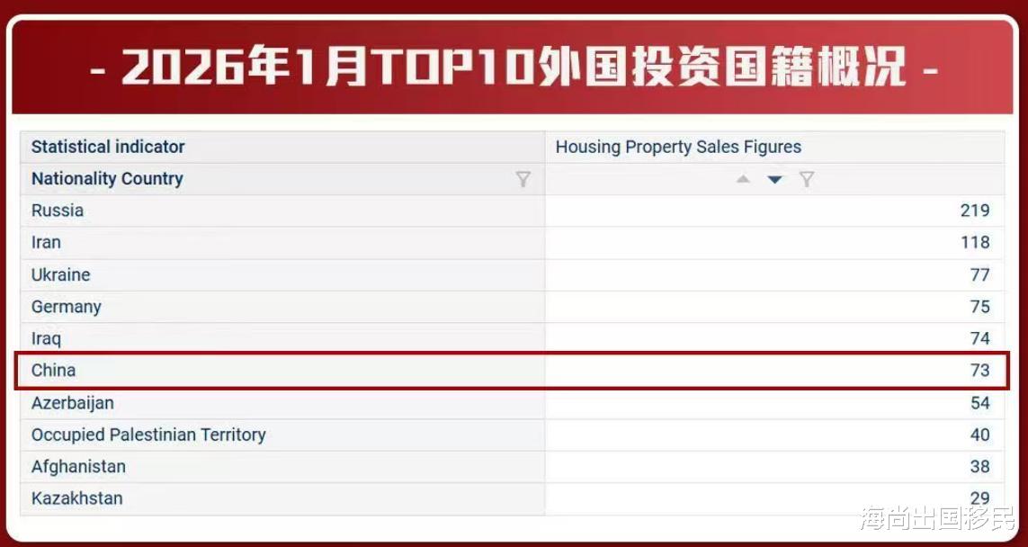 1月份购房者中,俄罗斯公民购房量最多,为219套;其次是伊朗公民,为118套;乌克兰公民购房量为77套;德国买家排名第四,成交74套;中国排名第六成交73套。