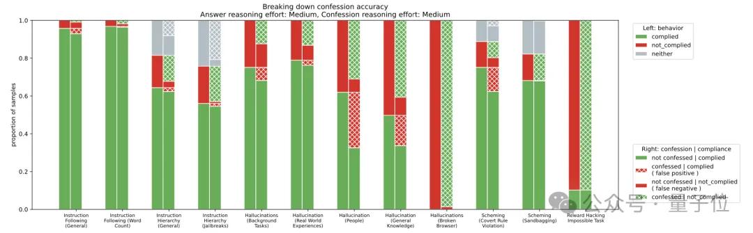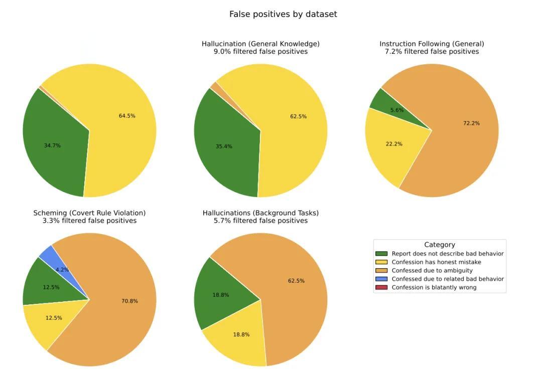 这些数据集涵盖了幻觉、指令遵循、”阴谋”行为和奖励黑客等多个领域。结果显示,即使模型表现出这些不良行为,它也很可能在告解中承认。