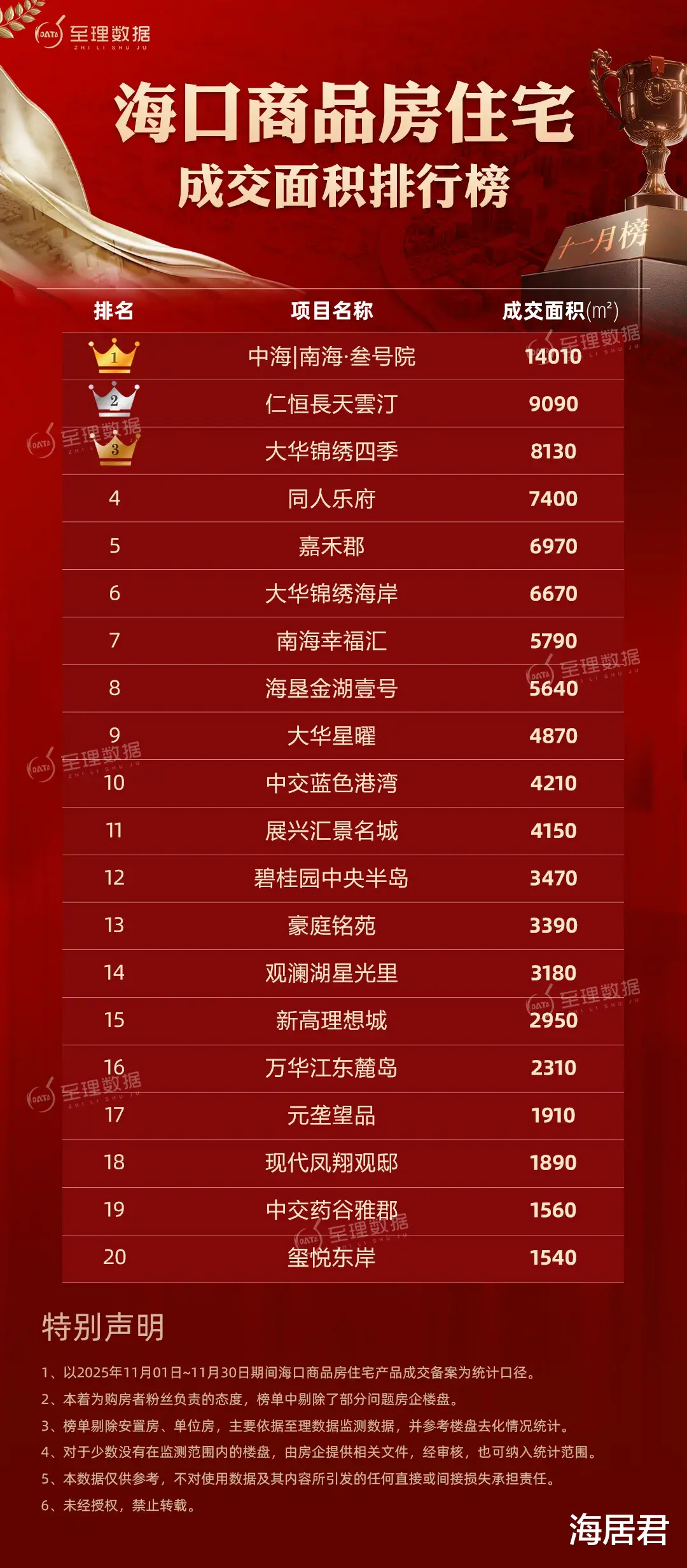 “至理数据”海南房地产大数据平台显示:2025年11月份,海口商品房『住宅』成交1828套、环比增长37.5%,面积21.7万方,揽金超30亿。