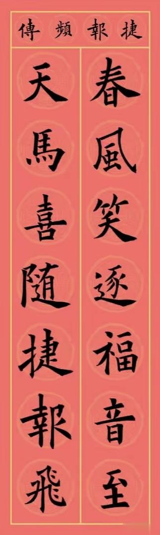 上联:春风笑逐福音至,下联:天马喜随捷报飞,横幅:捷报频传。