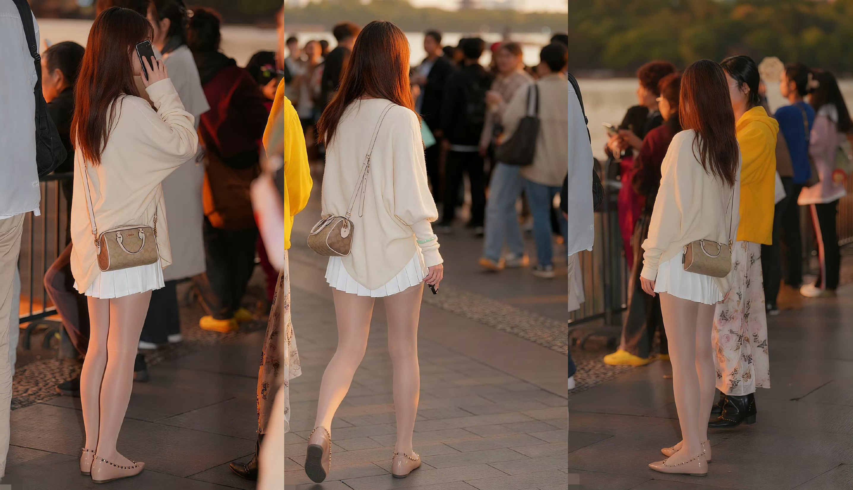然后,是风给的惊喜。一阵穿堂风过,她及膝的白色百褶裙摆,忽然有了生命。像被无形的手拨动的琴键,漾开层层柔软的弧度。那一瞬间的动感,让静态的街道忽然有了呼吸的节奏。
