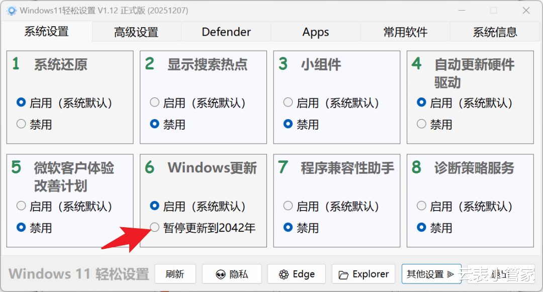 最实用的是能一键将Windows更新暂停至2042年,彻底告别强制更新烦恼;还能一键禁用或恢复Windows Defender,解决安装软件被拦截的问题。