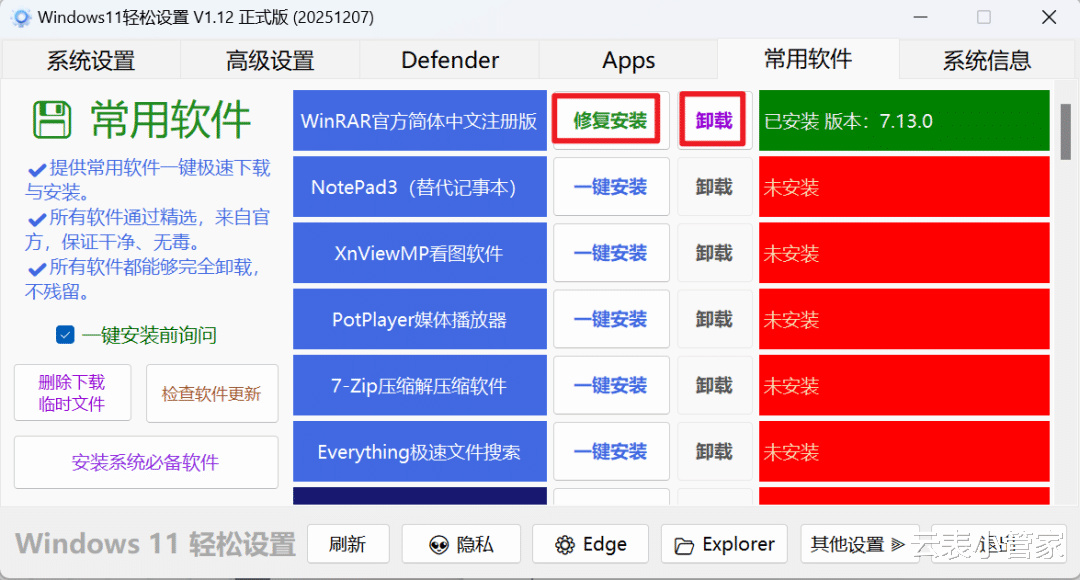 更贴心的是内置常用软件一键安装功能,小白也能轻松打造个性化纯净Win11系统。