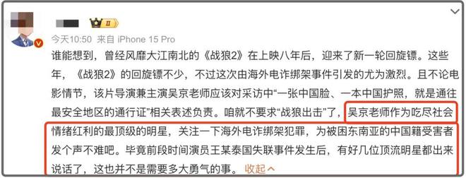 然而,现在网友们却莫名其妙地对吴京进行道德绑架,指责他靠《战狼2》赚取了丰厚利润,但在当前最热门的海外电信诈骗犯罪风波中却保持沉默。当时不少明星都转发了王星失踪的动态,但吴京并未转发。在这些人看来,吴京现在已成为资本,对这些事情漠不关心,只关注利用主旋律赚钱。
