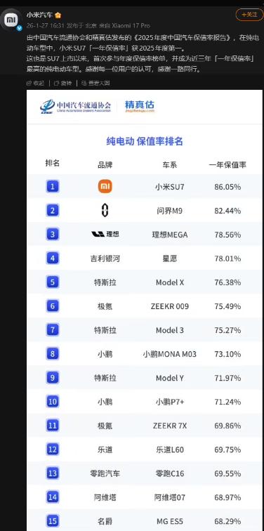 雷军对此拿出了中国汽车流通协会和精真估联合发布的“2025 年度中国汽车保值报告”,并解释道:“小米 SU7 的 2025 年度纯电车型一年保值率是 86.05%,(保值率)排名第一位,是保值率最强的电动汽车。所以我也不太理解那么多二手车商突然冒出来,欢迎大家在看到时帮我们举报一下。并且现在网上也有很多记者实地去二手车行采访,小米 SU7 在各家的流动速度、保值率方面都表现很出色。而且在过去几年里,小米 SU7 在各家的保值率都排在第一位,例如保时捷 Taycan 当时是 80.66%,特斯拉 Model S 是 81.72%,而小米 SU7 是以 86% 的保值率获得了第一名。”