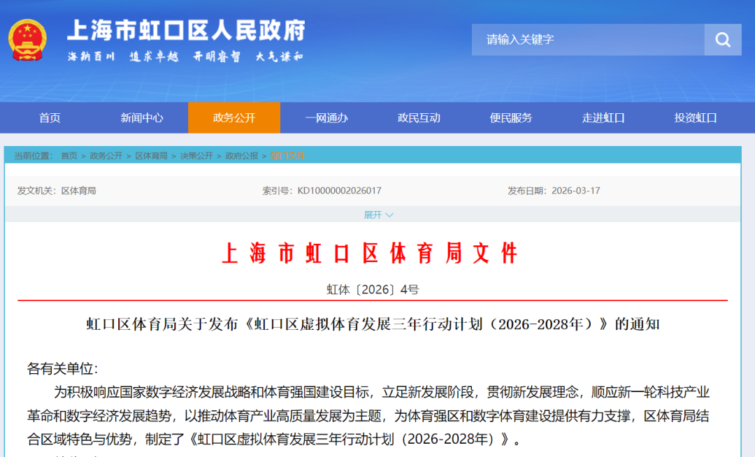 3月17日,上海市虹口区体育局正式发布《虹口区虚拟体育发展三年行动计划(2026 - 2028年)》。该计划旨在借助新兴技术,推动虚拟体育在多个领域的发展,提升区域核心竞争力。