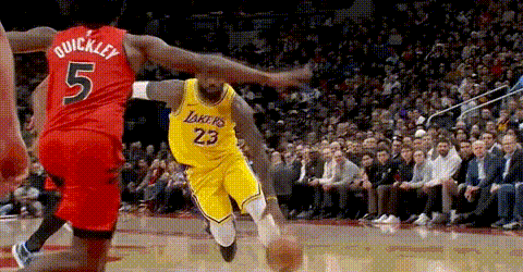 猛龙夹击小李,老詹火速切入,人们以为他要用这种方式接管,包括正在底角防守的奎克利。
