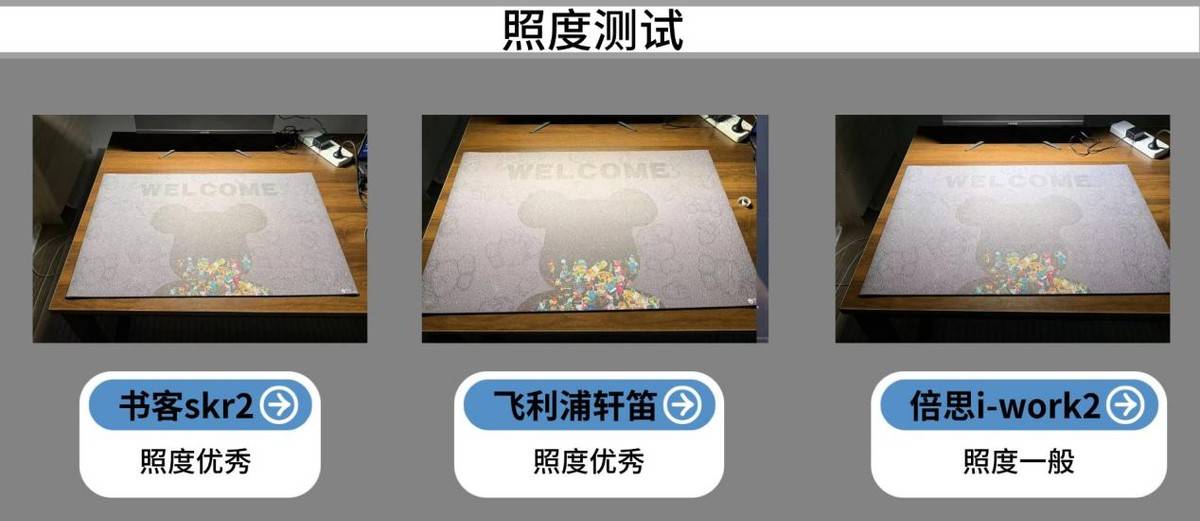 书客SKR2和飞利浦轩笛会好一点,不仅灯下中心亮度充足,桌面四角和屏幕边缘也同样均匀明亮,书客skr2采用新一代AOT Pro级光路菱镜结构,对光线进行精密拆解与重组,并配备定制聚光反射片和黄金17.5°光面角度设计。通过灯体两侧的高规格聚光反射片,光线经过二次聚焦和定向校正,覆盖范围均匀,亮度稳定,整体光感柔和舒适。相比之下,倍思i-Work2的照度表现稍弱,前方亮度较高,但桌面后部和屏幕边缘偏暗,容易造成明暗落差,使用时视觉体验不如另外两款。