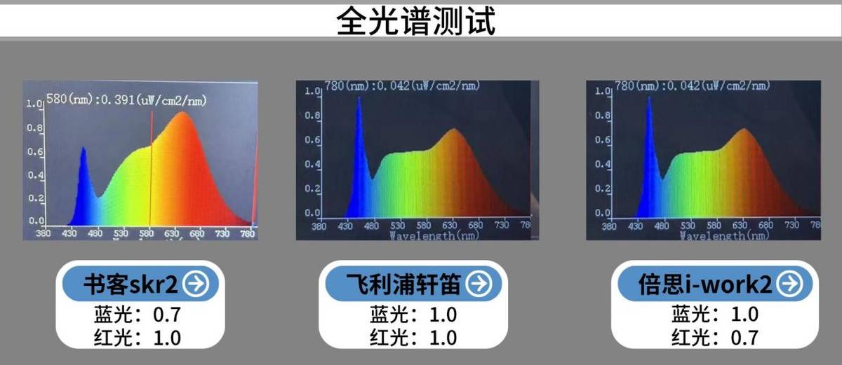 从实测来看,书客skr2和飞利浦轩笛的红光表现都不错,均达到1.0,对缓解眼疲劳有一定帮助。不过在蓝光控制上差异明显:书客SKR2表现最佳,蓝光含量仅0.7,搭载SpectraBlue2.0技术,不是简单降低亮度,而是通过优化光线路径吸收并转化有害短波蓝光,使蓝光辐射降低约64%,用眼更舒适护眼。而飞利浦轩笛和倍思i-work2的蓝光都是比较高的,达到了1.0,属于高蓝光含量,而倍思i-work2的红光含量仅有0.7,从光谱方面来说,护眼效果比较不理想。