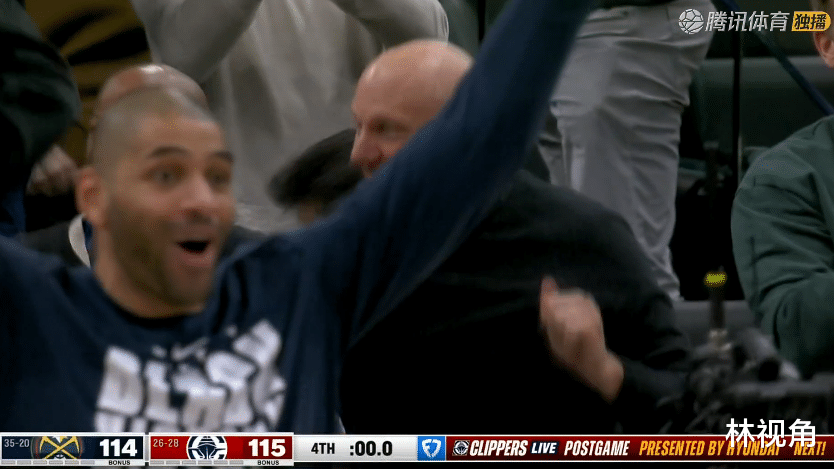 比赛结束,快船球员激情庆祝,老板鲍尔默在场边振臂怒吼,这庆祝比起球员来也是毫不逊色,激情十足。