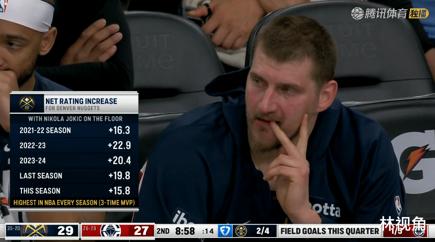 马瑟林三分打铁,约基奇篮下打进,追平比分,约基奇命中率也提升很快。