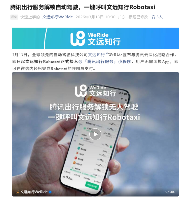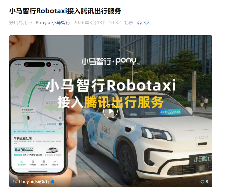 PChome 3月13日消息,文远知行、小马智行宣布,旗下Robotaxi(自动驾驶出租车)服务正式接入微信“腾讯出行服务”小程序,用户无需下载独立APP,即可在微信内完成叫车、乘车、支付全流程,为民众提供更便捷的出行服务。