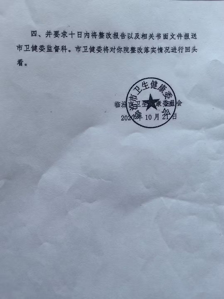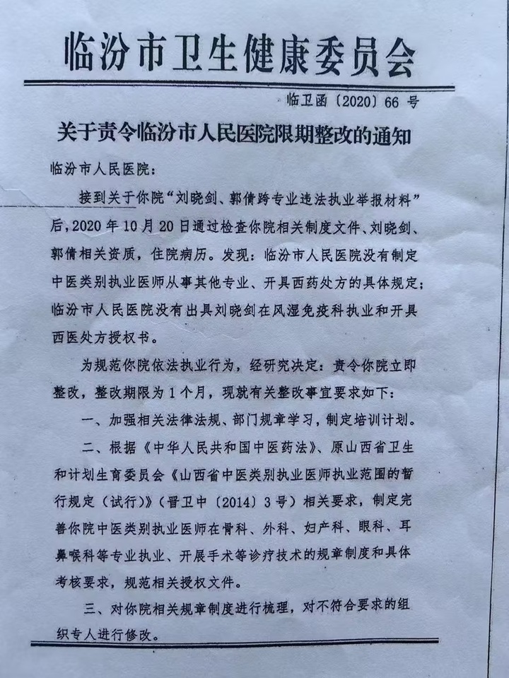记者调查发现,针对刘晓剑跨专业执业问题,临汾市卫健委早在2020年10月就已接到举报并作出处理。编号为“临卫函〔2020〕66号”的《关于责令临汾市人民医院限期整改的通知》显示,经核查医院制度文件、刘晓剑及郭某资质与住院病历,发现医院未制定中医类别医师从事其他专业、开具西药处方的具体规定,也未向刘晓剑出具风湿免疫科执业及开具西药处方的授权书。卫健委据此责令医院限期一个月整改。