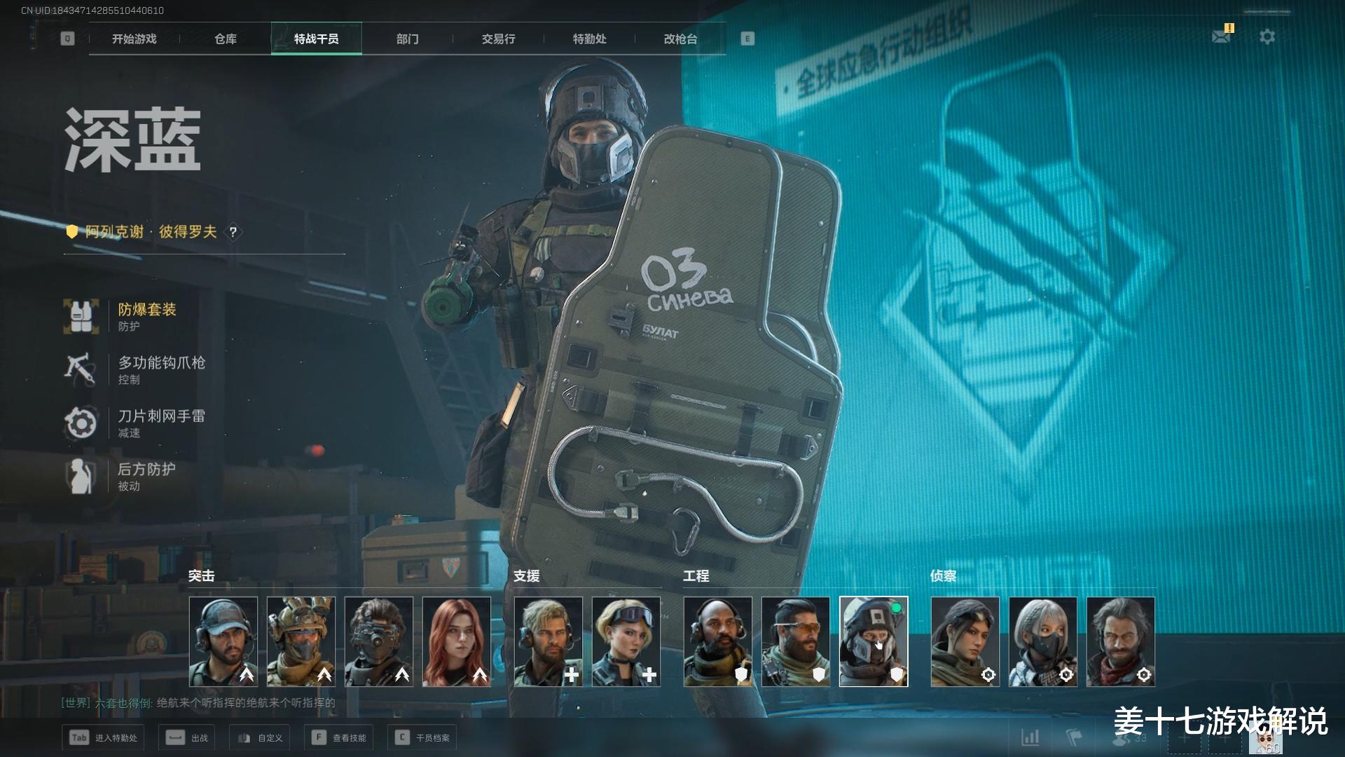 第二名:深蓝,不得不承认,S8赛季重新归来的教官的确是强化了不少,特别是击倒后切枪,基本可以让别人束手无策,可问题是现在的教官依然只能举盾120秒,然后就体力不支了,当然,最关键的,是深蓝这个干员还可以扔铁丝网,我就特别喜欢玩铁丝网加肘击加切枪的玩法,基本可以把一个刘涛大佬给秒掉。